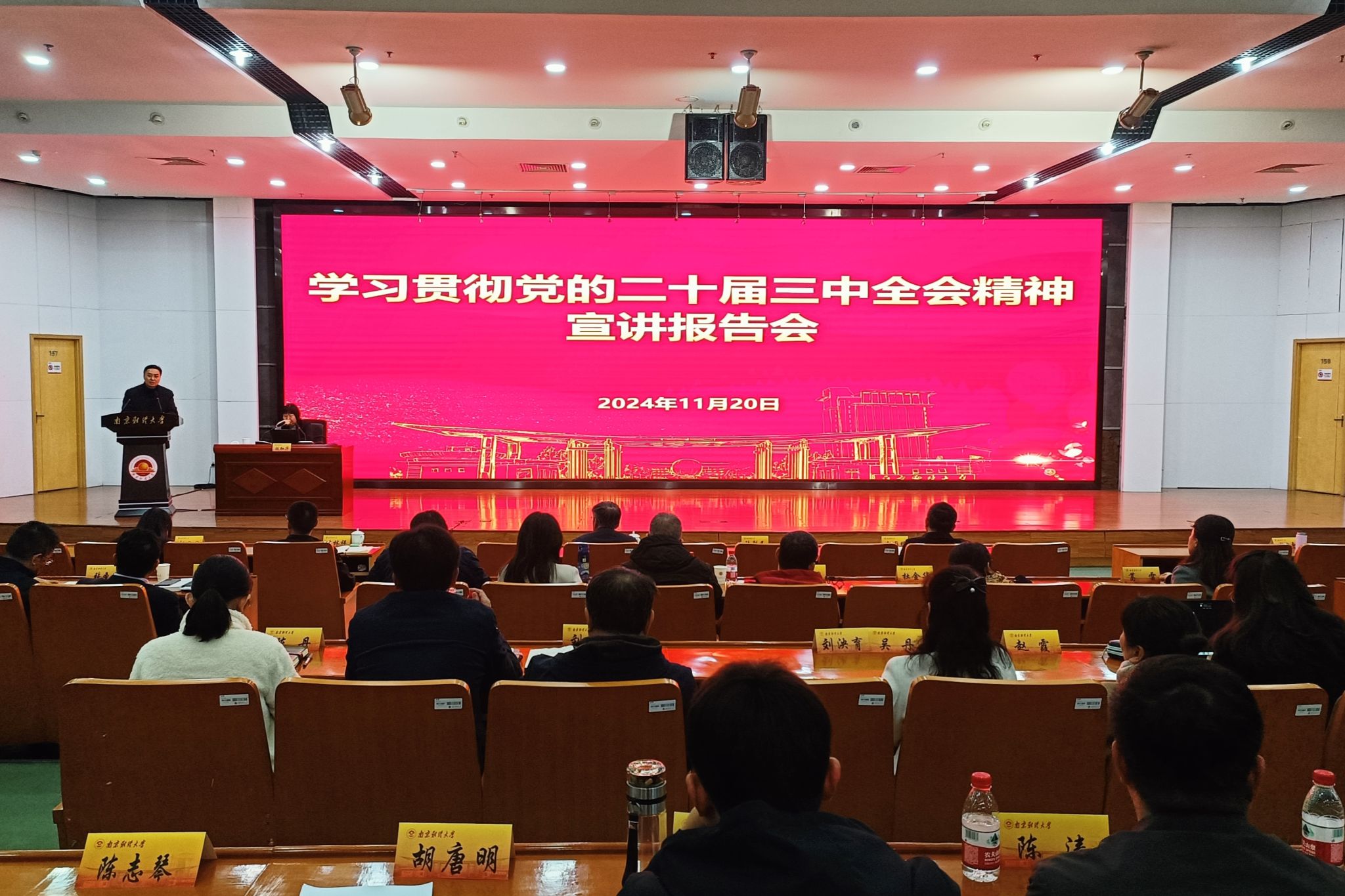 11月20日下午,bat365学习贯彻党的二十届三中全会精神宣讲报告会在仙林校区图书馆一楼报告厅举行。江苏省委党校党史党建教研部主任、教授张加华应邀作宣讲报告。全体校领导,全体党委委员、纪委委员,全体中层干部参加报告会。报告会由党委常委、宣传部部长朱军主持。