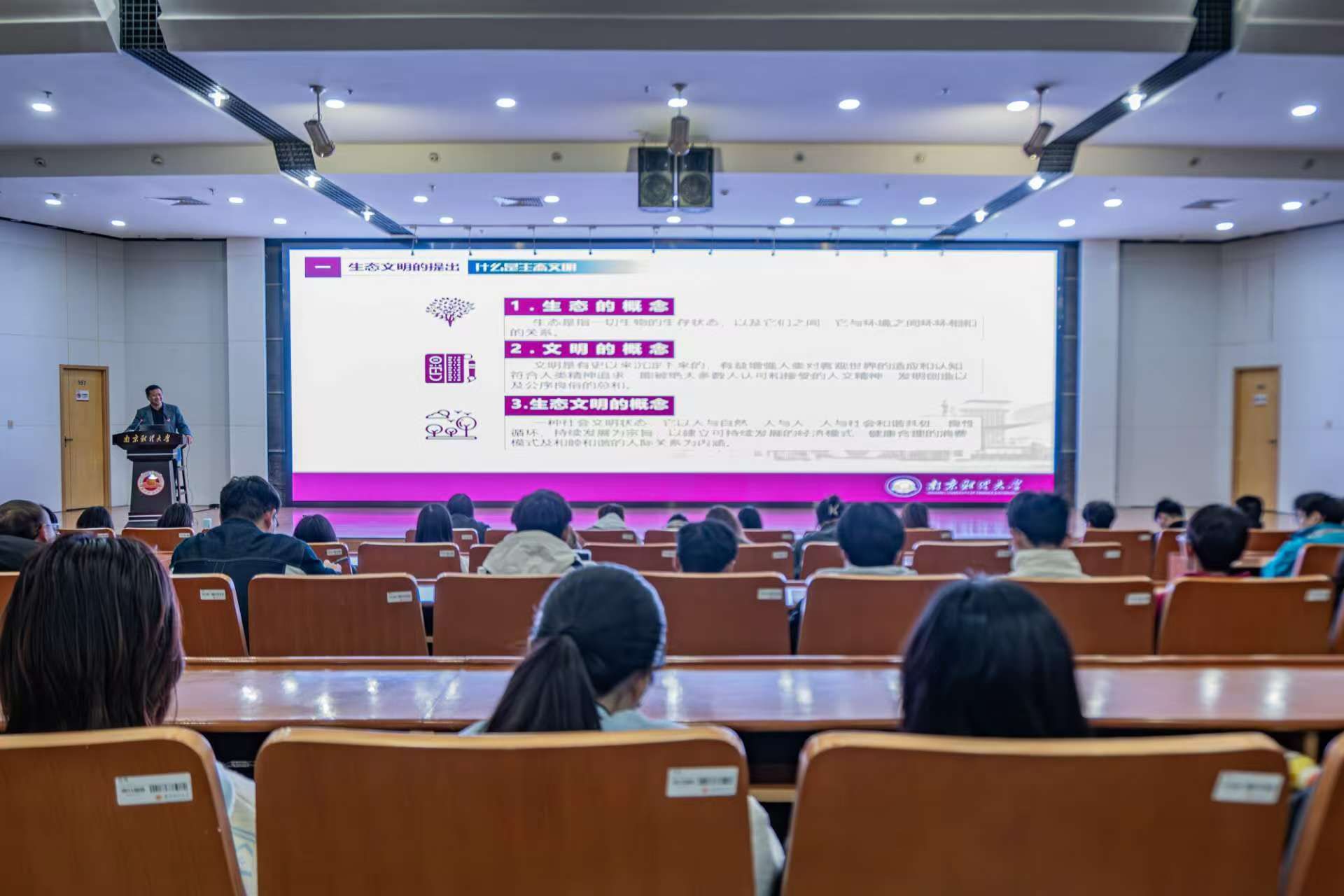 11月22日晚,校党委书记张利民在仙林校区图书馆报告厅为师生讲授了题为“习近平生态文明思想的理论与实践”的形势与政策课。党政办、党委宣传部、学生处、教务处、马克思主义学院、外国语学院相关负责人,党政办支部党员代表,形势与政策课授课教师代表,本科生毕业生党员代表,马克思主义学院研一学生代表,研究生毕业生党员代表,研究生骨干代表,信息工程学院大数据管理与应用专业、外国语学院英语专业、新闻学院网络与新媒体专业、新闻学专业和汉语言文学专业全体大三学生参加学习。