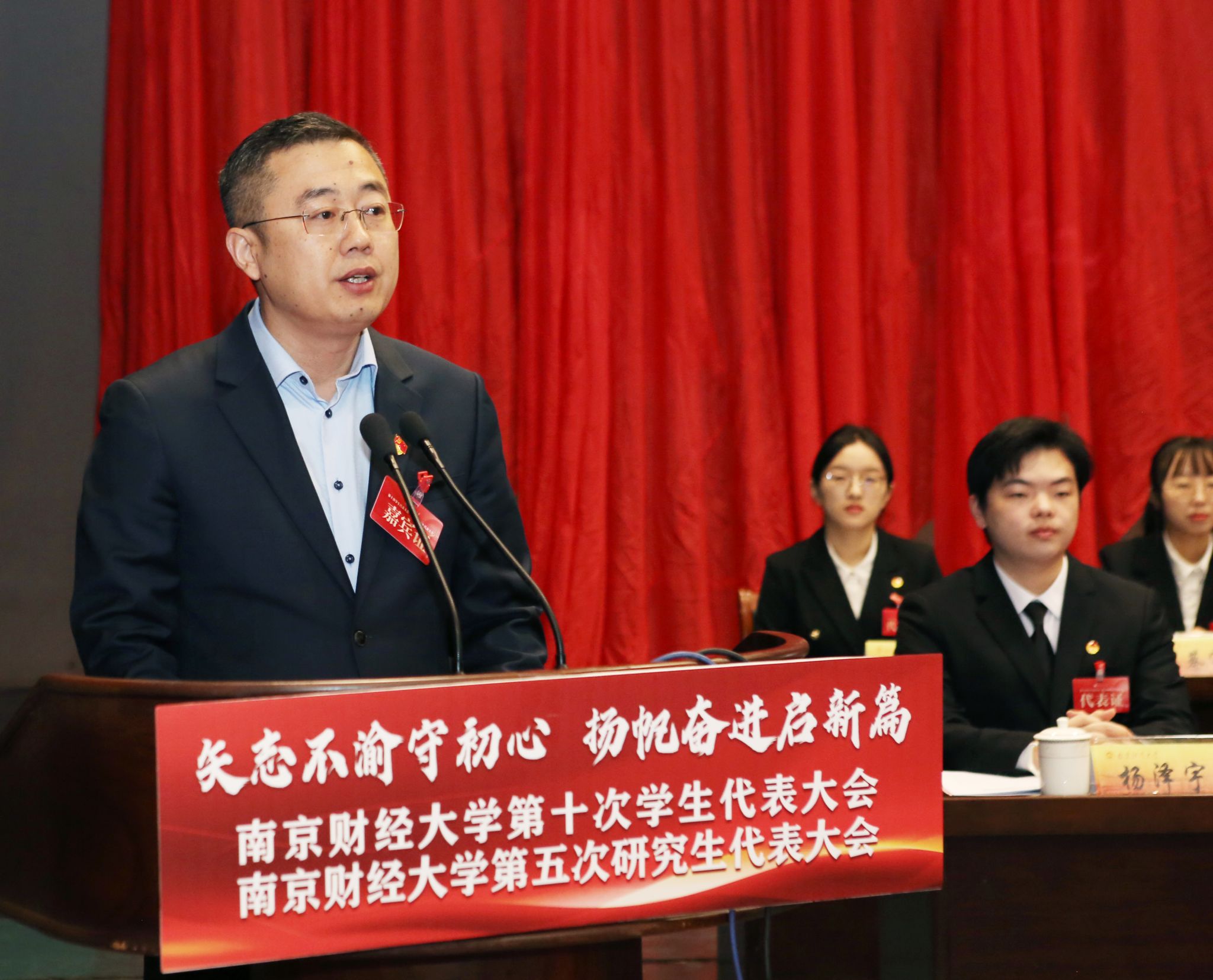 赵国栋副校长致辞。他代表学校党委和行政向大会的召开表示热烈祝贺,向全校青年学生致以诚挚问候,对过去一年学生会、研究生会工作取得的成绩给予充分肯定。赵国栋副校长向校院两级学生会、各级学生组织以及广大南财青年提出四点希望:一是牢记“革命理想高于天”,坚定理想信念毫不动摇;二是牢记“事业靠本领成就”,淬炼本领素质毫不懈怠;三是牢记“把小我融入大我”,投身创新实践永不止步;四是牢记“打铁必须自身硬”,恪守服务初心永不变色。赵国栋副校长号召南财青年要更加紧密地团结在以习近平同志为核心的党中央周围,在学校党委和省学联的坚强领导下,扎扎实实、踏踏实实落实好这次“两代会”确定的各项目标任务,奋力推动全校学生会、研究生会工作高质量发展。