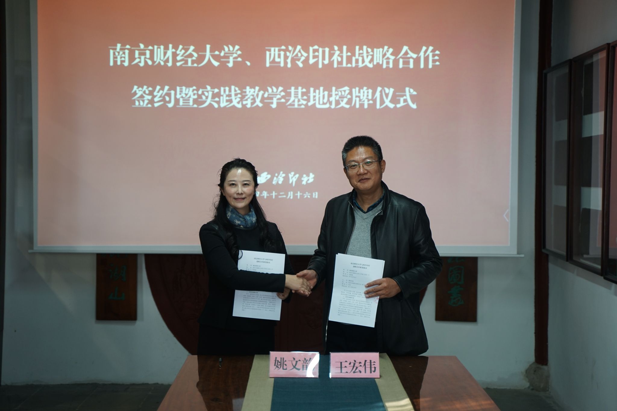 会上,姚文韵副校长与王宏伟副书记代表双方签署《战略合作框架协议》。王宏伟副书记代表西泠印社向艺术教育中心主任段伟伟授牌。