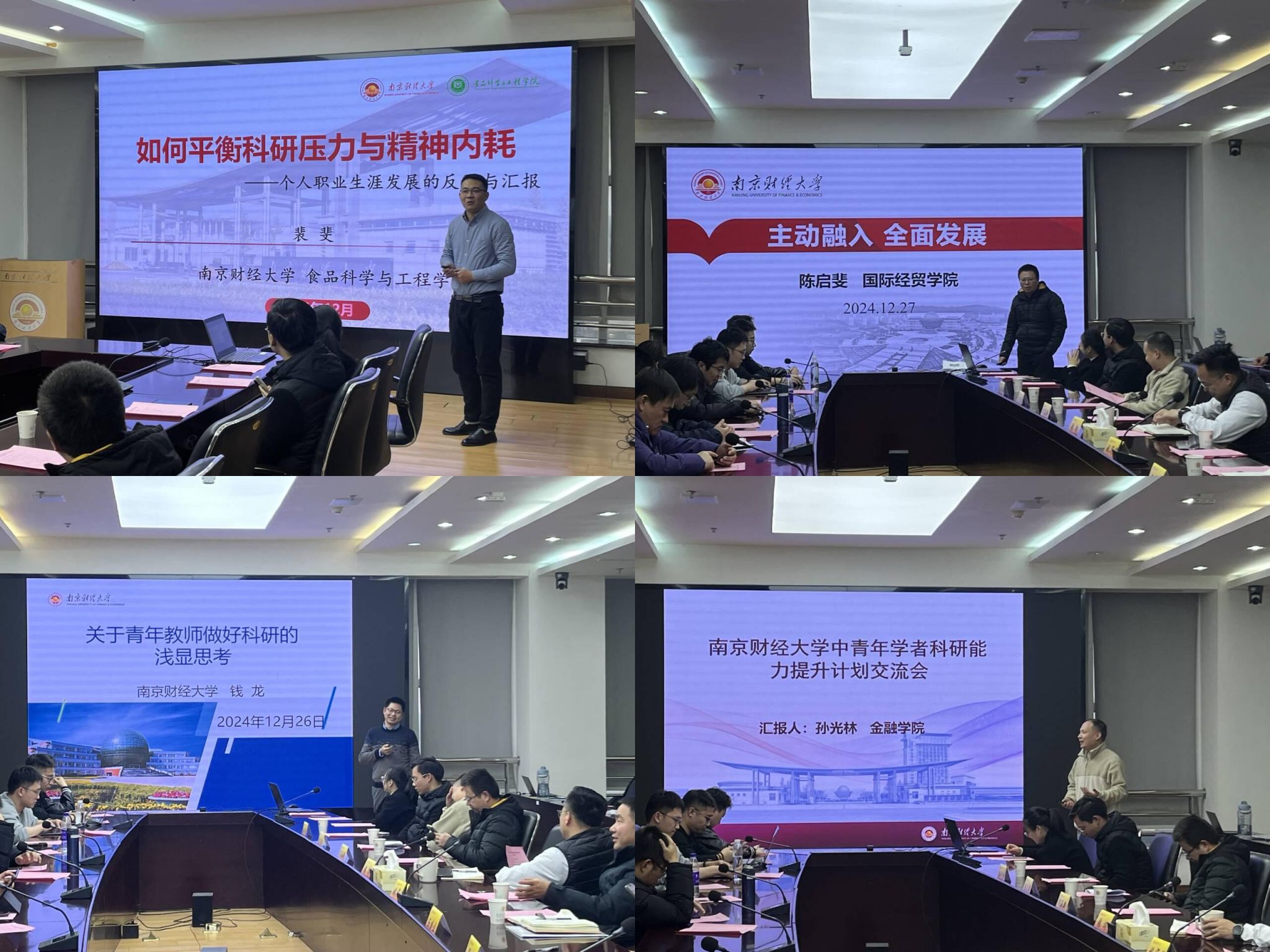 12月26、27日,bat365在仙林校区行政楼16楼会议室举办中青年学者科研能力提升计划系列讲座。食品科学与工程学院裴斐、国际经贸学院陈启斐、粮食和物资学院钱龙、金融学院孙光林受邀作了主题为“高校教师职业生涯规划与发展”的学术讲座。本次活动由科学研究院,党委教师工作部、人事处,青年教师发展委员会共同主办。活动由副校长张炳主持。