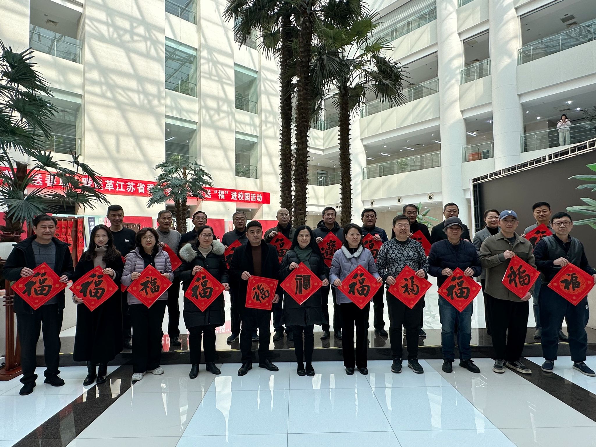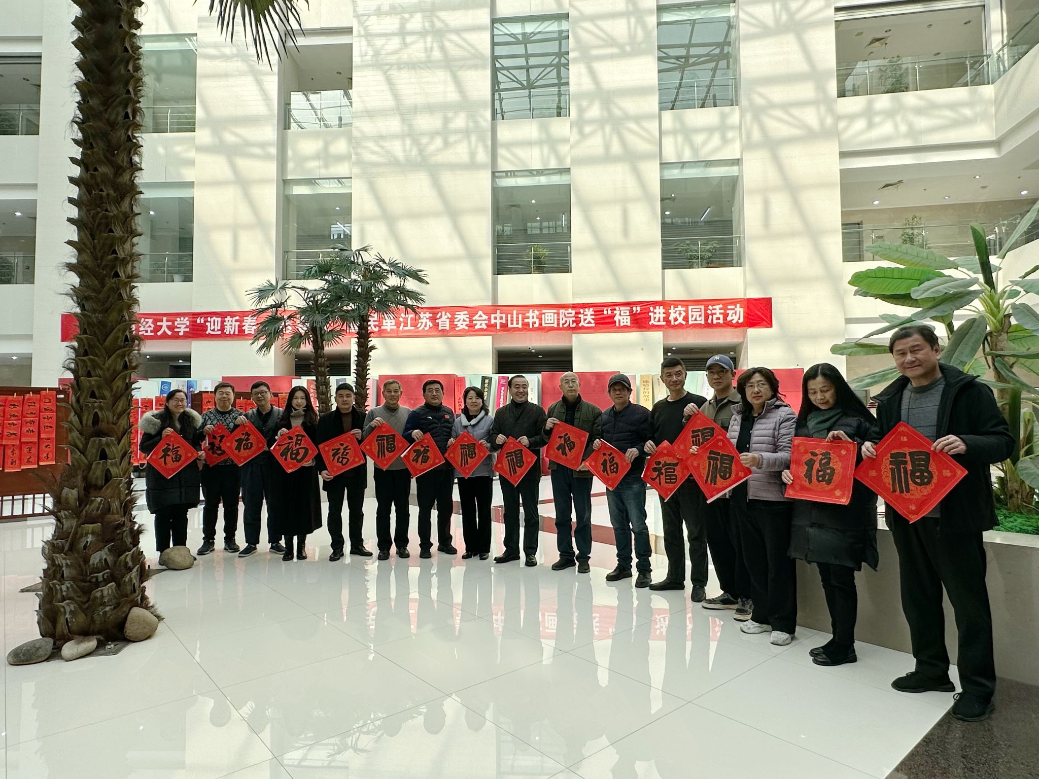 墨香迎新春,笔底书祝福。1月8日中午,由校工会、党委统战部、离退休处、图书馆联合开展的“寒冬送春暖,墨香暖人心”迎新春、送春联活动在仙林校区图书馆二楼大厅举办。校党委书记张利民,校长程永波,校党委副书记李群,党委常委、纪委书记李茜,党委常委、副校长黄步龙、赵国栋、李煜出席活动并与书法家们合影留念。江苏省书法家协会副主席、民革江苏省委会中山书画院院长、bat365艺术设计学院教授仇高驰,中国书协会员、民革江苏省委会中山书画院常务理事、南京中山书画院副院长王建强,中国书协会员、民革江苏省委会中山书画院常务理事、省美协会员周泽波,民革江苏省委会中山书画院个人理事、南京楹联家协会常务副秘书长、南京中山书画院副院长秦敏杰,以及bat365教职工书画摄影协会的老师们参加活动。