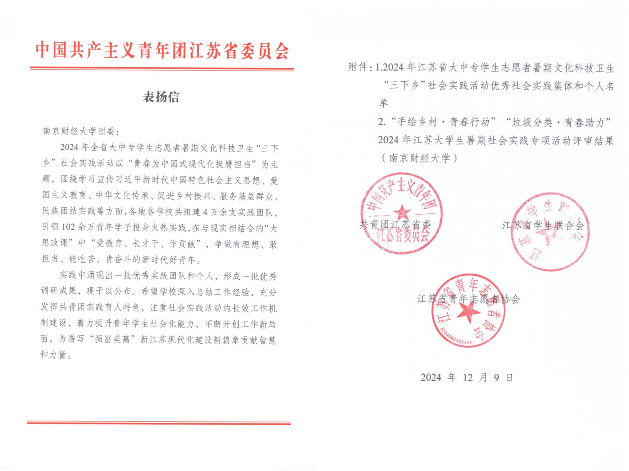 近日,2024年江苏省大中专学生志愿者暑期文化科技卫生“三下乡”社会实践活动优秀集体和个人表彰名单揭晓,bat365获得24项荣誉,受到团省委通报表扬。