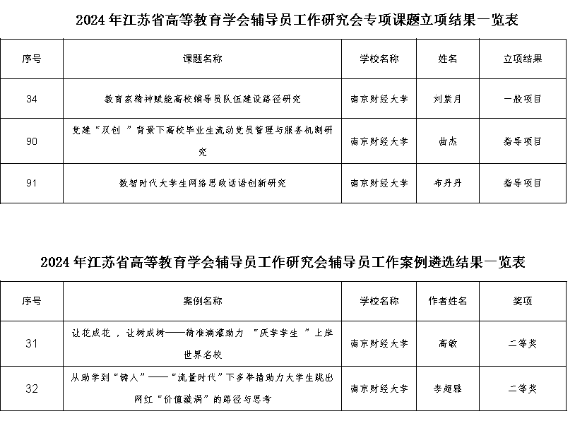 据悉,2024年江苏省高校辅导员工作专项课题、工作案例征集活动共收到专项课题251项、辅导员工作案例203篇,最终立项176项,遴选出辅导员工作优秀案例122项。