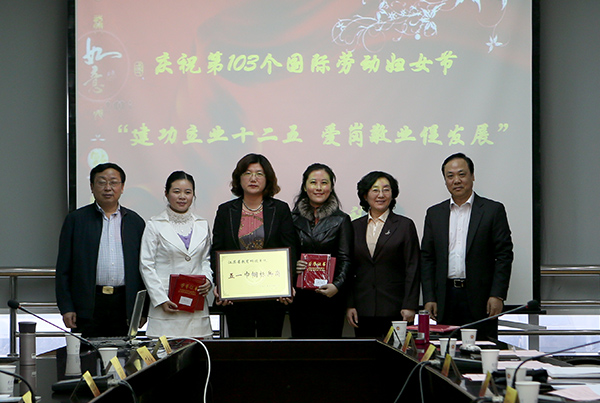 校工会主席高再飞宣读了《关于表彰江苏省教育科技系统“五一巾帼标兵岗”、“五一巾帼标兵”的决定》:bat365国际合作与交流处被评为江苏省科技系统“五一巾帼标兵岗”,财务处副处长姚文韵、会计学院贺伊琦老师获得江苏省教育科技系统“五一巾帼标兵”荣誉称号。校领导陈章龙、程光熙、鞠兴荣为获此殊荣的集体和个人颁奖并合影留念。