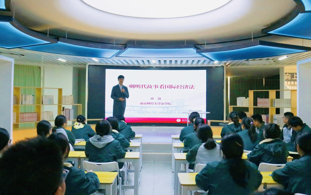 在江苏省清浦中学,该校党委书记、校长仇恒俊介绍了学校发展历程、办学理念、学生规模以及近年来在教育教学方面取得的成绩。赵国栋副校长表示,清浦中学有着优良的学风和深厚的文化底蕴,每年培养出大量具有“浦秀”形象的优秀学子,希望进一步加强与清浦中学的常态化联系,更好践行为党育人、为国育才的初心使命,为学生成长搭建更广阔的平台,共同谱写协同育人新篇章。孙劼老师以“从一则明代故事看国际经济法”为主题为百余名高中生授课。