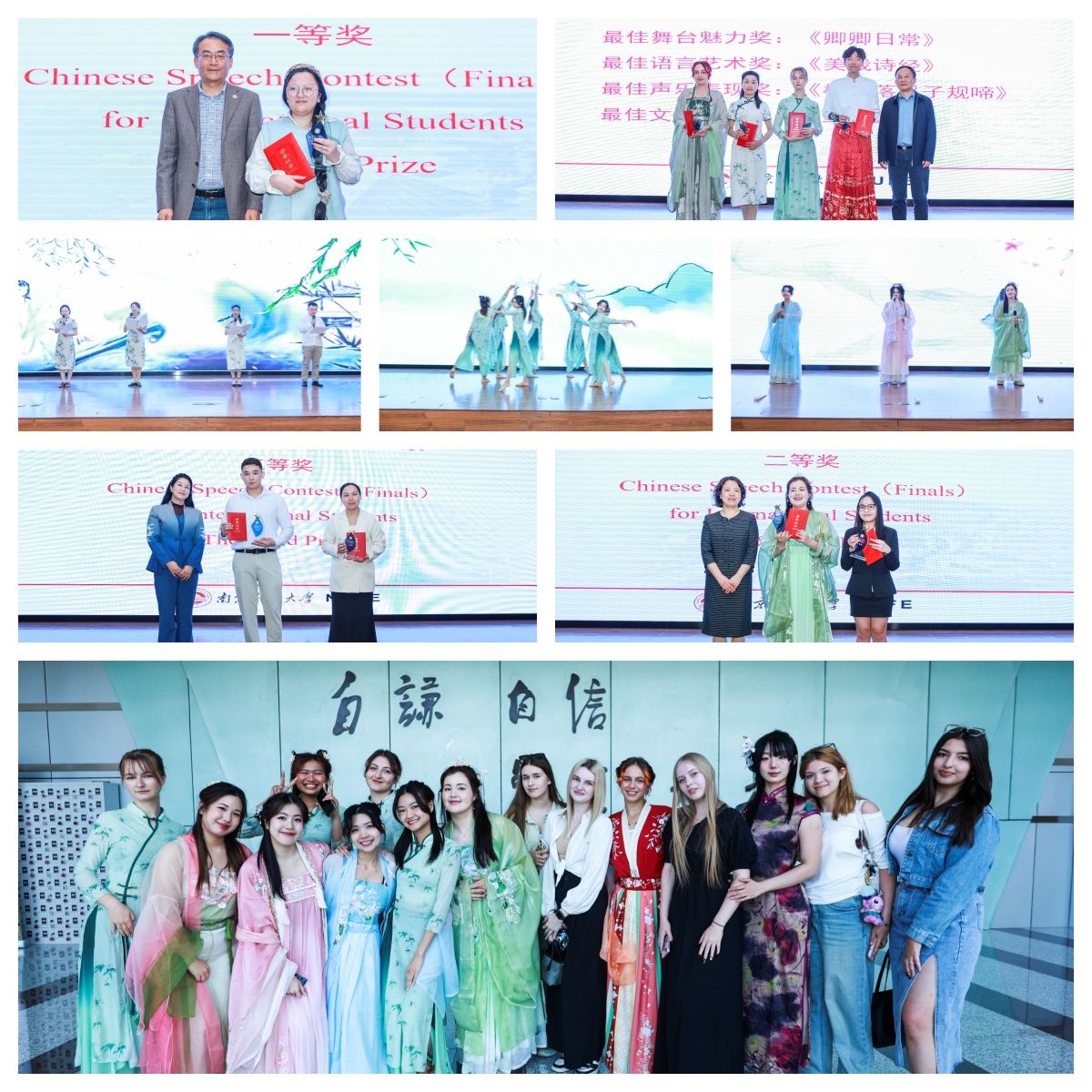 在中文演讲比赛决赛中,五位来自不同国家的学生用流利的中文逐一分享了他们留学中国的感人故事。经观众现场投票,马来西亚留学生李玥鐛(LEE YEH YING)以“双城记:从槟城到南京的文明河流”为题,讲述了她从马来西亚槟城到南京的文化之旅,获评一等奖;哈萨克斯坦留学生姜美丽(JAXYBEKOVA MARIAM)与马来西亚留学生李紫靖(LEE ZHI JING)获评二等奖;哈萨克斯坦留学生拉万(ZEINOLLA RAUAN)与金华洋(KIM KARINA)获评三等奖。
