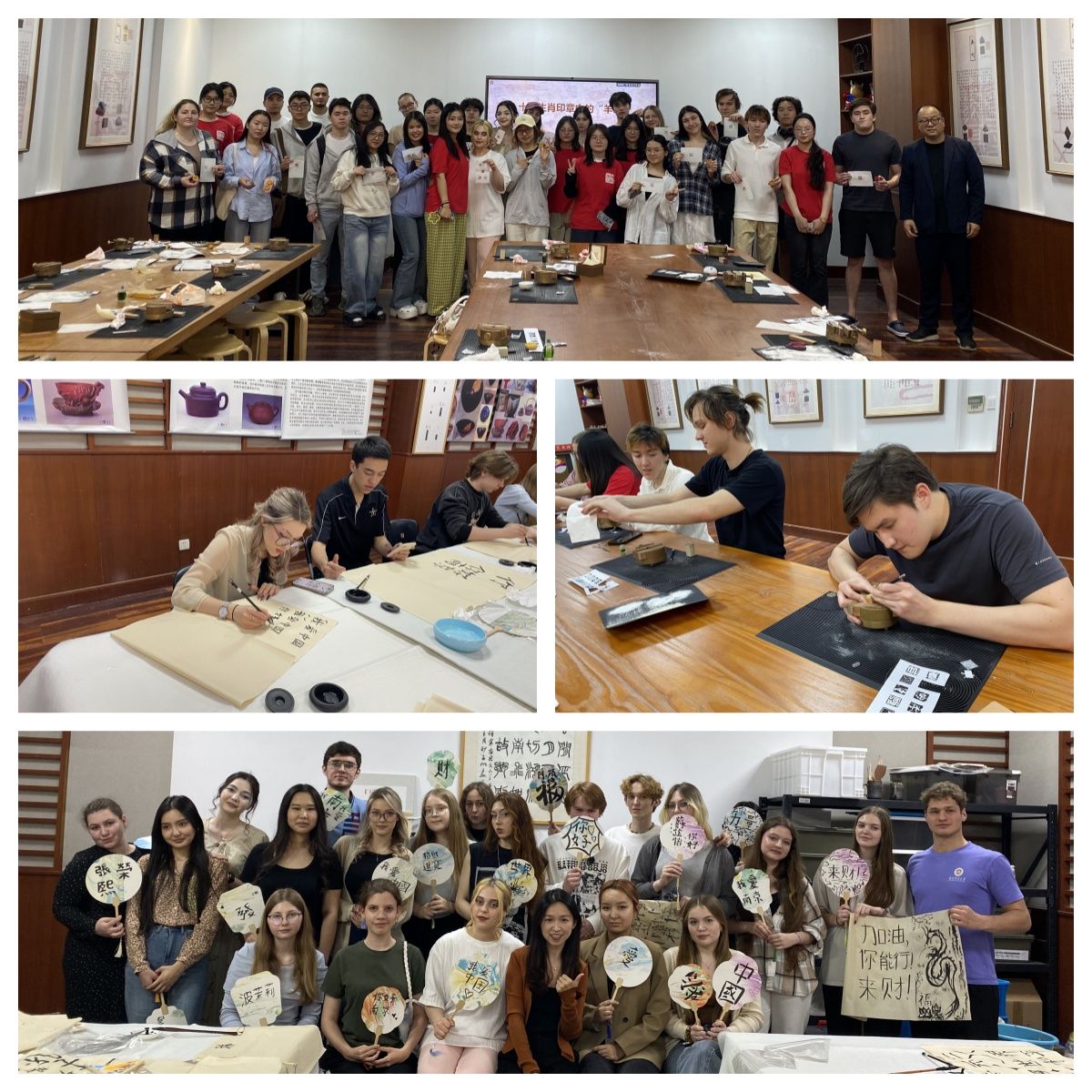 下午,留学生们在何连海教授与李梦媛老师的指导下,在大学生活动中心体验了中国传统篆刻与书法艺术。从执刀刻印到挥毫泼墨,留学生们在方寸之间感受汉字艺术的博大精深。