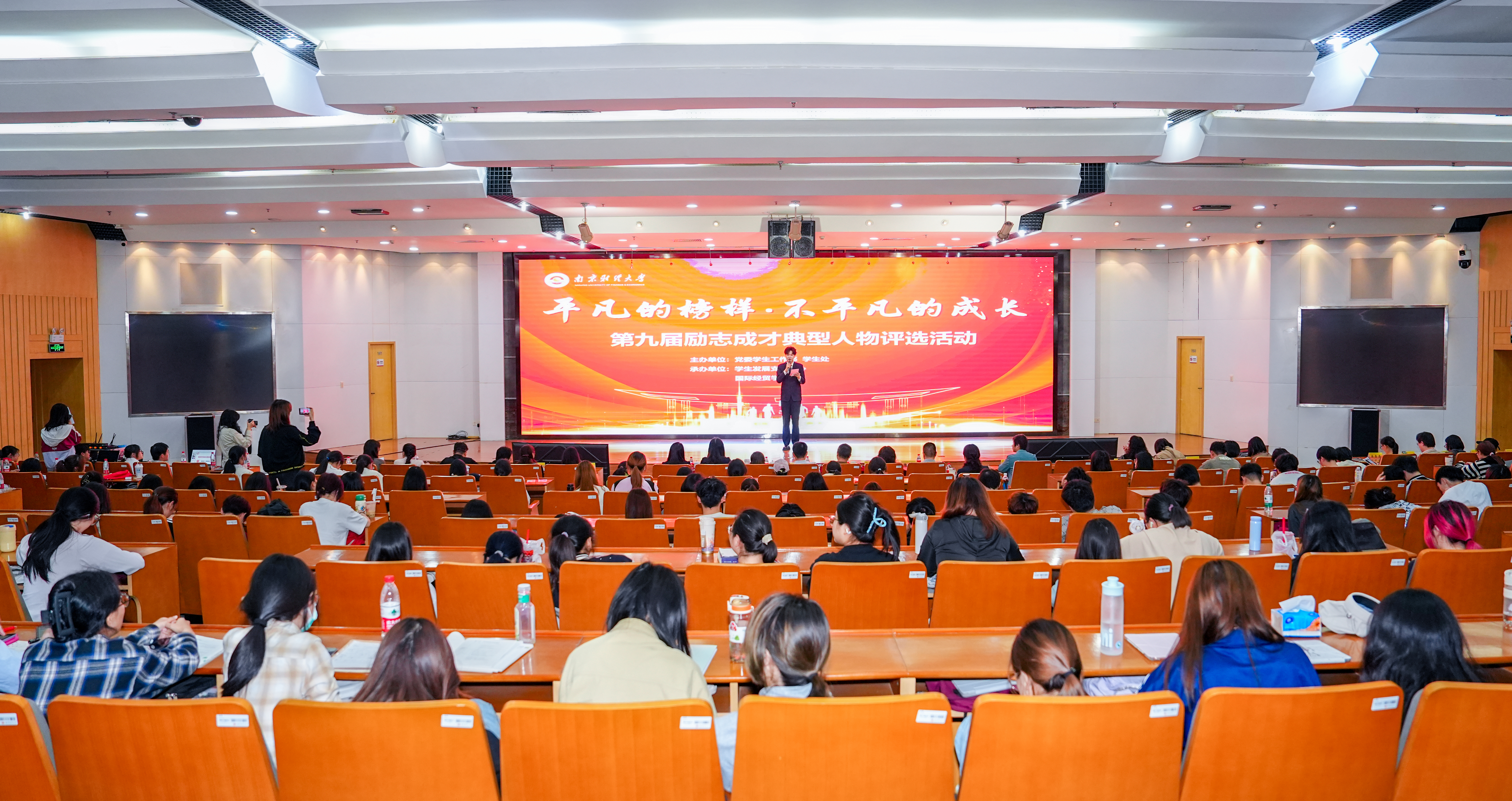 4月23日下午,bat365第九届“平凡的榜样·不平凡的成长”励志成才典型人物评选终选活动在仙林校区图书馆一楼报告厅举办。活动由党委学生工作部、学生处主办,学生发展支持中心、国际经贸学院承办。党委常委、副校长赵国栋出席活动并为励志成才典型人物颁奖和赠书。江苏省学生资助管理中心主任刘振华,中国药科大学学工部副部长、研工部副部长(主持工作)方芳,南京中医药大学学生工作处副处长孟亚平,bat365党委学生工作部部长韩力争、党委研究生工作部部长郝园园、对外联络处处长陆明峰、团委书记张蔚伟担任评委。来自各学院的近三百名师生参加活动并为心仪的选手投票助阵。