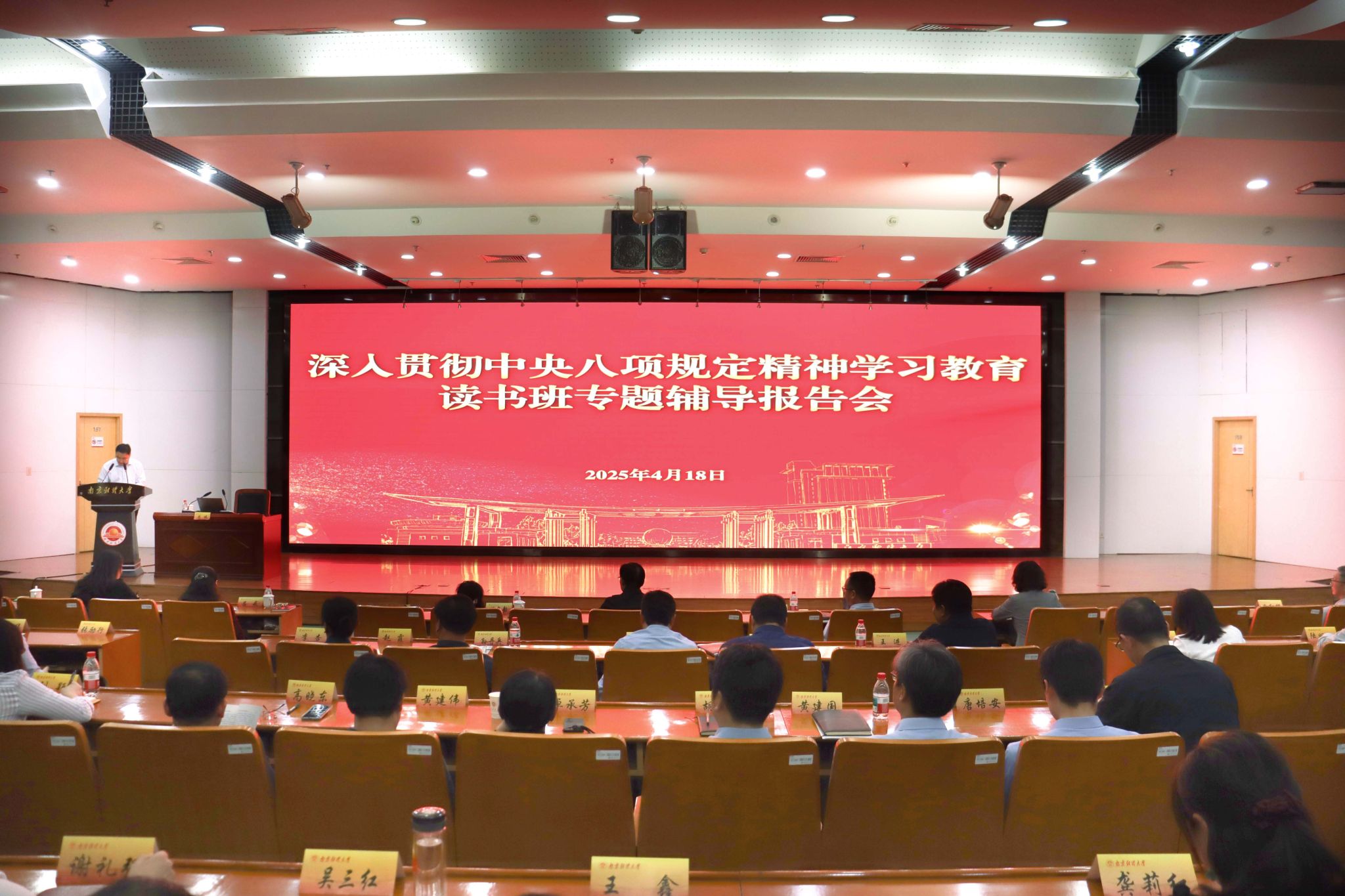 根据学校深入贯彻中央八项规定精神学习教育读书班安排,4月18日下午,bat365在仙林校区图书馆报告厅举办深入贯彻中央八项规定精神学习教育读书班专题辅导报告会。栖霞区纪委副书记、监委副主任周佩应邀作专题辅导报告。全体校领导,全体党委委员、纪委委员,全体中层干部,资产经营有限公司主要负责人参加报告会。报告会由党委常委、宣传部部长朱军主持。