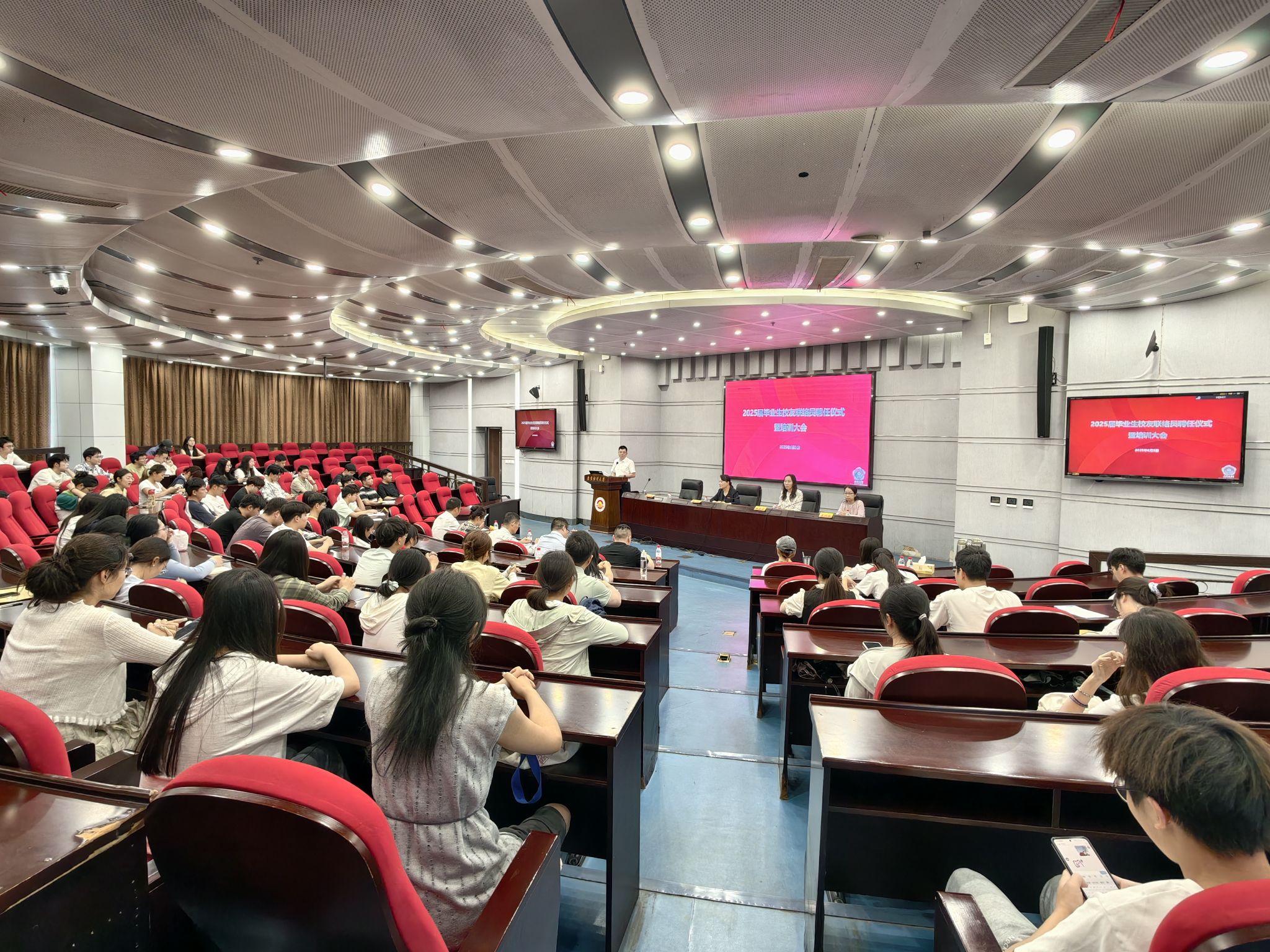 王冲副处长宣读《bat365官方网站校友会关于聘任2025届校友联络员的决定》。相关职能部门负责人分别为2025届本科生、研究生校友联络员代表颁发聘书。