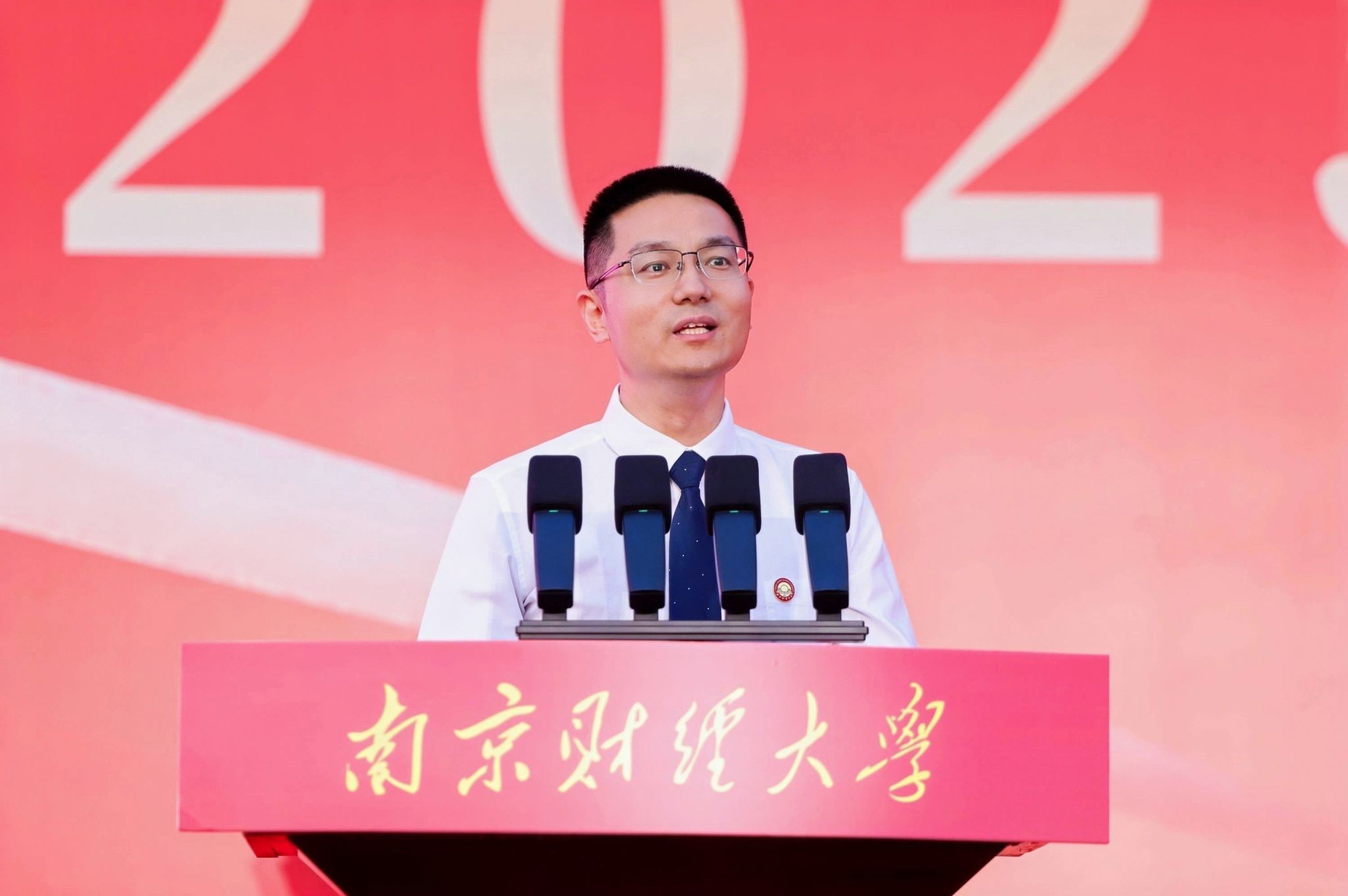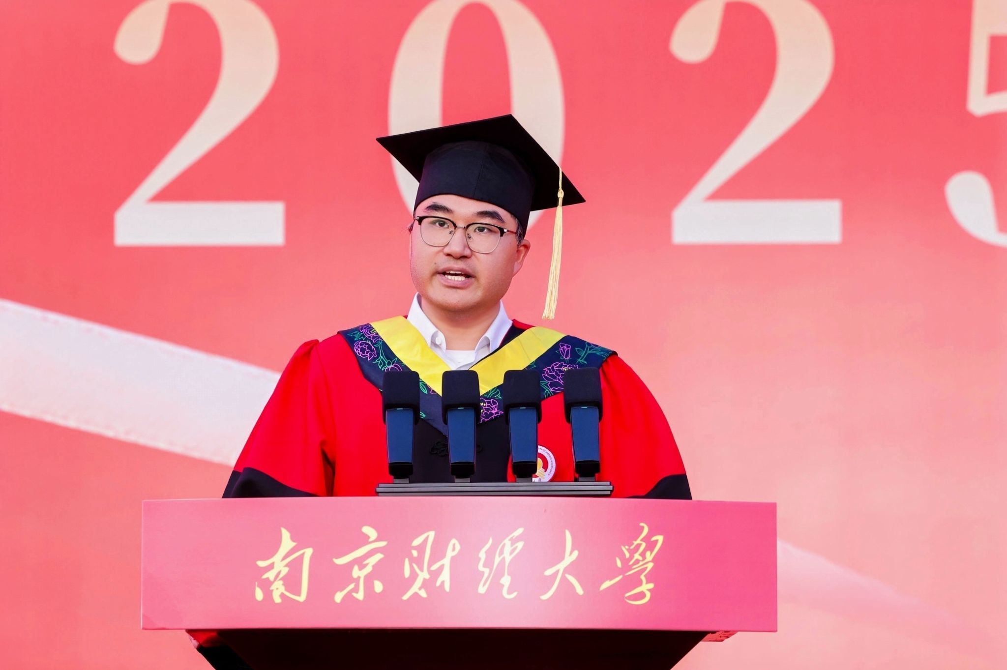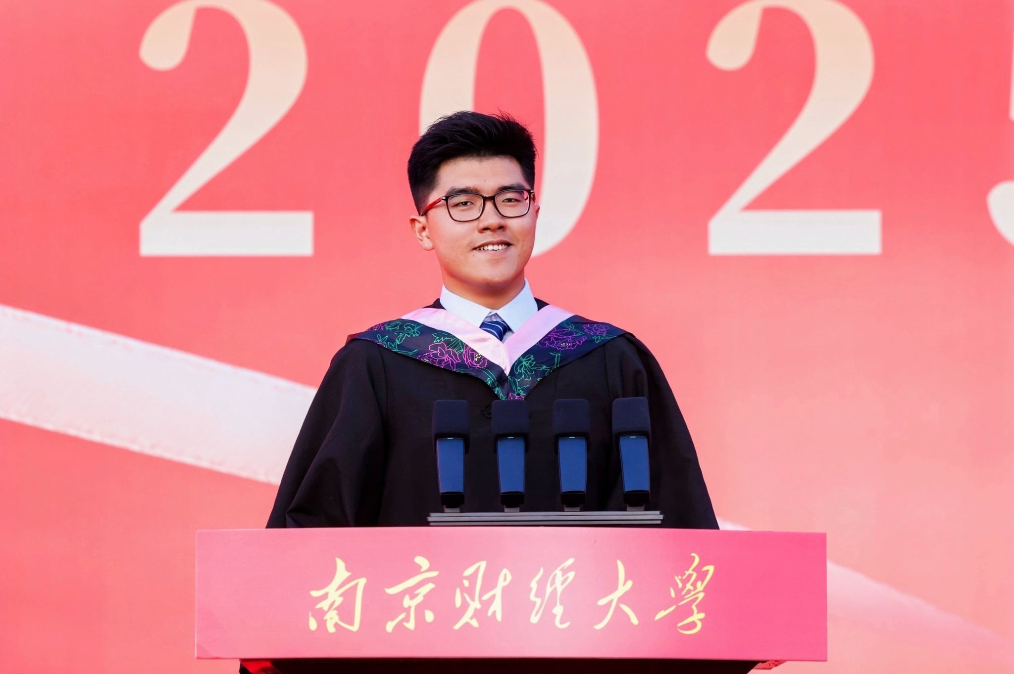 毕业生代表、财政与税务学院税收专业税收2103班苏岩峰同学发言,回顾了在校的求学时光,表示将以财经智慧服务发展大局,以青春热血践行时代使命,用实际行动践行“请党放心、强国有我”的青春誓言。
