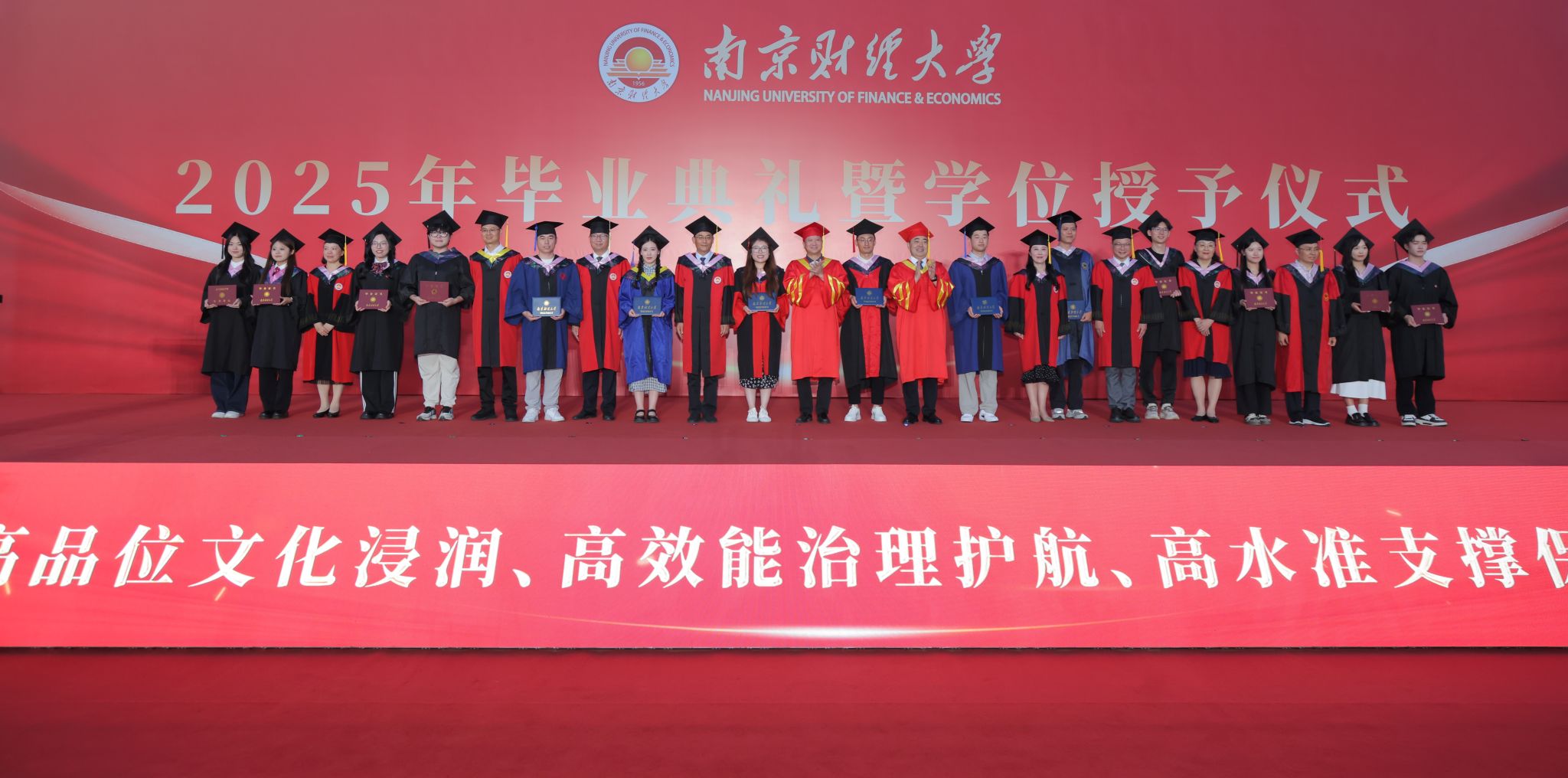 全体毕业生紧握右拳,庄严宣誓。在铿锵有力的毕业誓词和悠扬的《南财大之歌》中,2025届毕业生的青春故事翻开了新的一页。