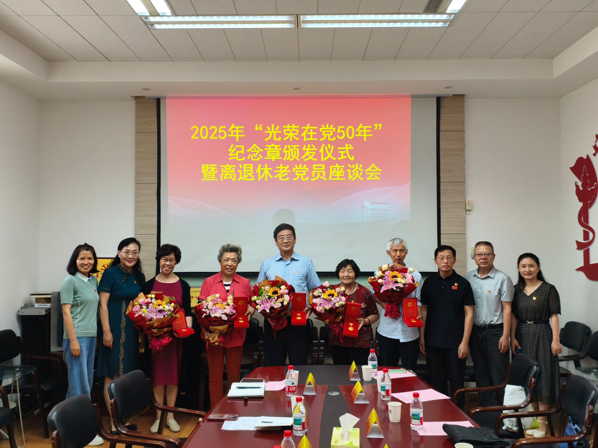 6月26日上午,bat365在福建路校区离退休党委会议室举办2025年“光荣在党50年”纪念章颁发仪式暨离退休老党员座谈会。党委常委、副校长黄步龙,党委常委、组织部部长吕戎出席会议。获得“光荣在党50年”纪念章的老党员代表姜建中、陈明桂、周锁海、薛琴、花凤兰,离退休工作处处长唐习华、副处长潘春艳参加会议。会议由离退休党委书记杨玉中主持。
