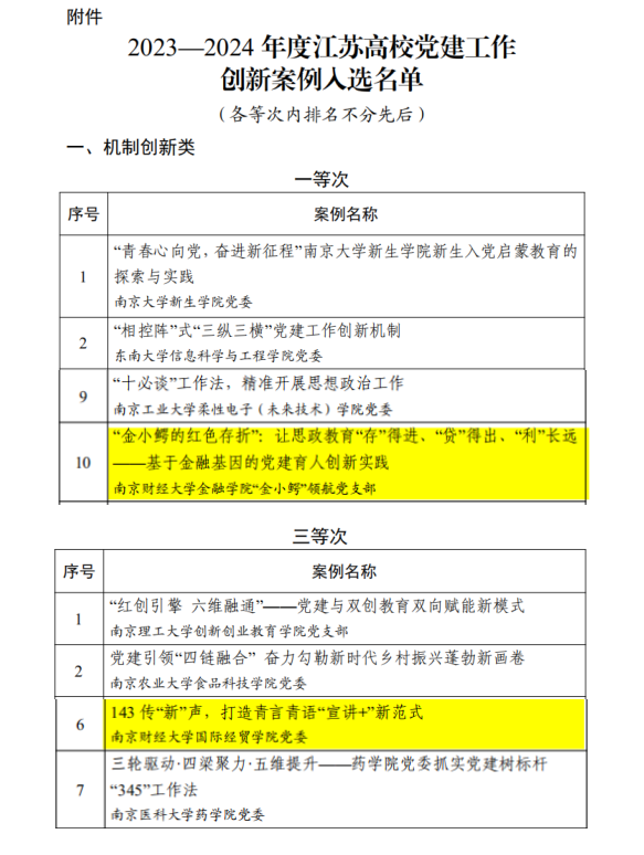 近日,江苏省委教育工委公布2023-2024年度江苏高校党建工作创新案例评选结果。bat365推荐报送的4项案例全部入选,获一等次1项、二等次1项、三等次2项,实现在全省党建项目评选中一等次获奖零的突破,充分彰显了bat365党建工作的特色成效与创新活力。