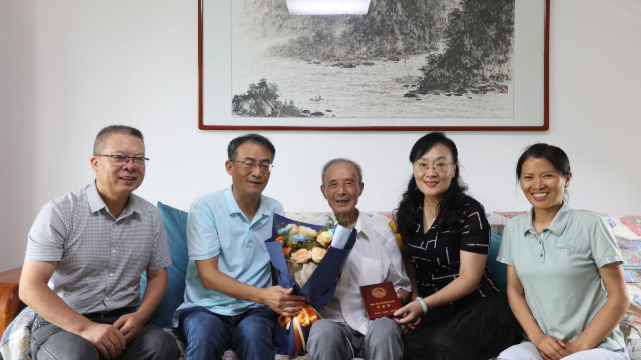 虽已近期颐之年,牛老仍精神矍铄,坚持每日看报,心系国家发展与学校建设。当他接过中共中央、国务院、中央军委颁发的“中国人民抗日战争胜利80周年”纪念章时,心情十分激动,由衷表达了对党的深切感恩,并勉励年轻教师、青年学生要认真工作、勤奋学习,坚决听党话、跟党走,为党和国家事业发展作出应有贡献。李群副书记对牛老坚如磐石的理想信念和无私奉献的家国情怀深感敬佩,并表示像牛老这样老一辈的革命者是党和国家的宝贵财富,要传承和弘扬他们身上所体现的抗战精神和崇高风范,赓续红色血脉、汇聚奋进力量;要用心用情做好服务保障,让老战士老同志安享幸福晚年;要深入挖掘并大力宣传他们的光辉事迹与高尚品德,教育引导广大党员干部从中汲取精神力量,凝聚发展共识,以更加昂扬的姿态和扎实的作风,投身国内一流的高水平财经大学建设新征程,奋力谱写学校高质量发展新篇章。