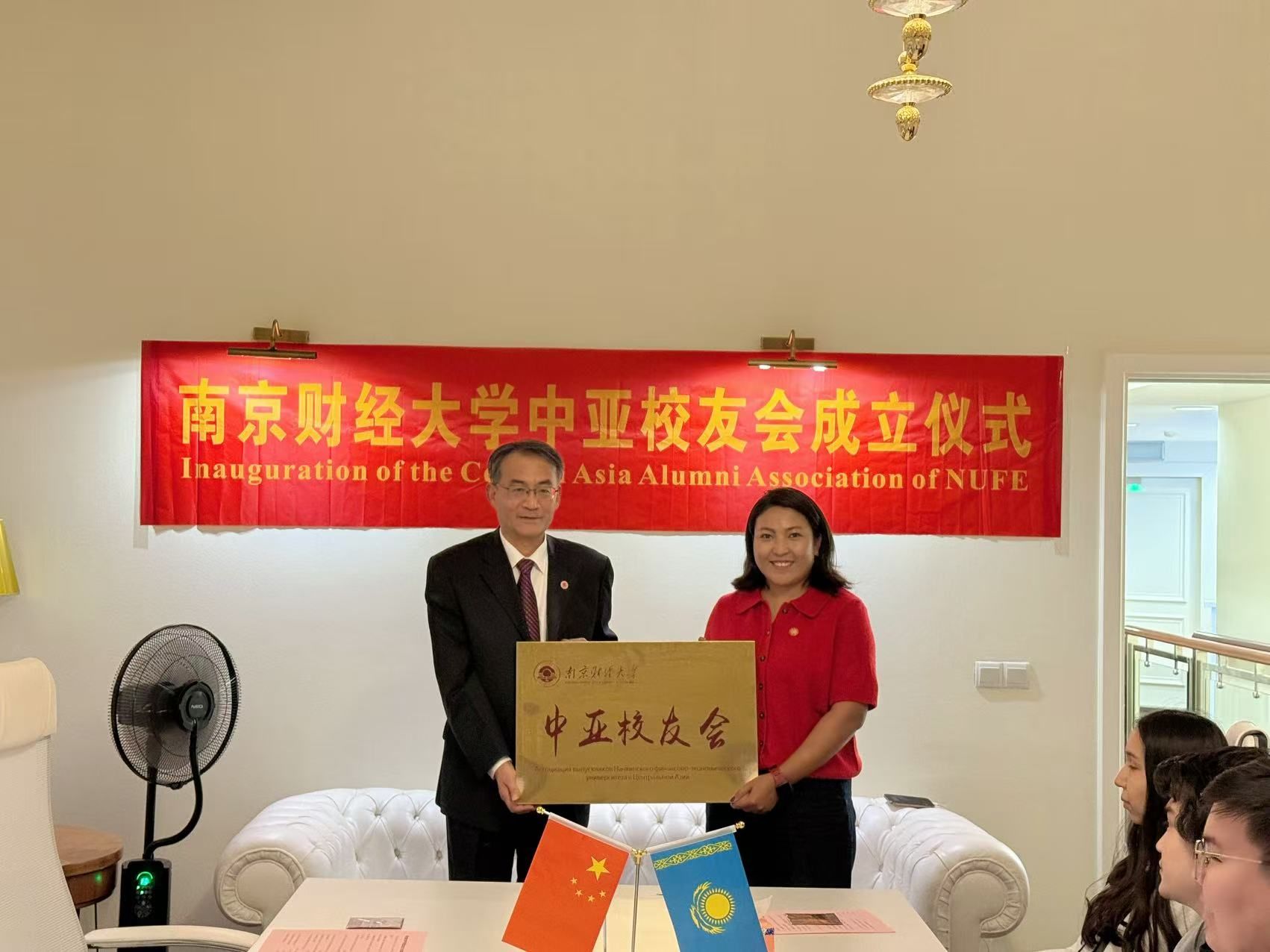 李群副书记为中亚校友会授旗、授牌,并与王娟书记共同为第一届理事会负责人颁发聘书。
