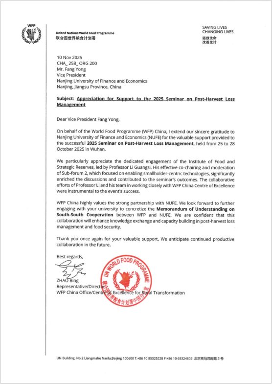 此次收到WFP的官方致谢,是bat365长期以来深耕粮食领域的重要成果,也是中国高校积极参与全球治理、贡献中国智慧的生动缩影。未来,bat365将继续深化与联合国世界粮食计划署等国际组织的紧密合作,以专业知识和实践经验,为推动全球粮食安全和可持续发展提供“南财方案”。