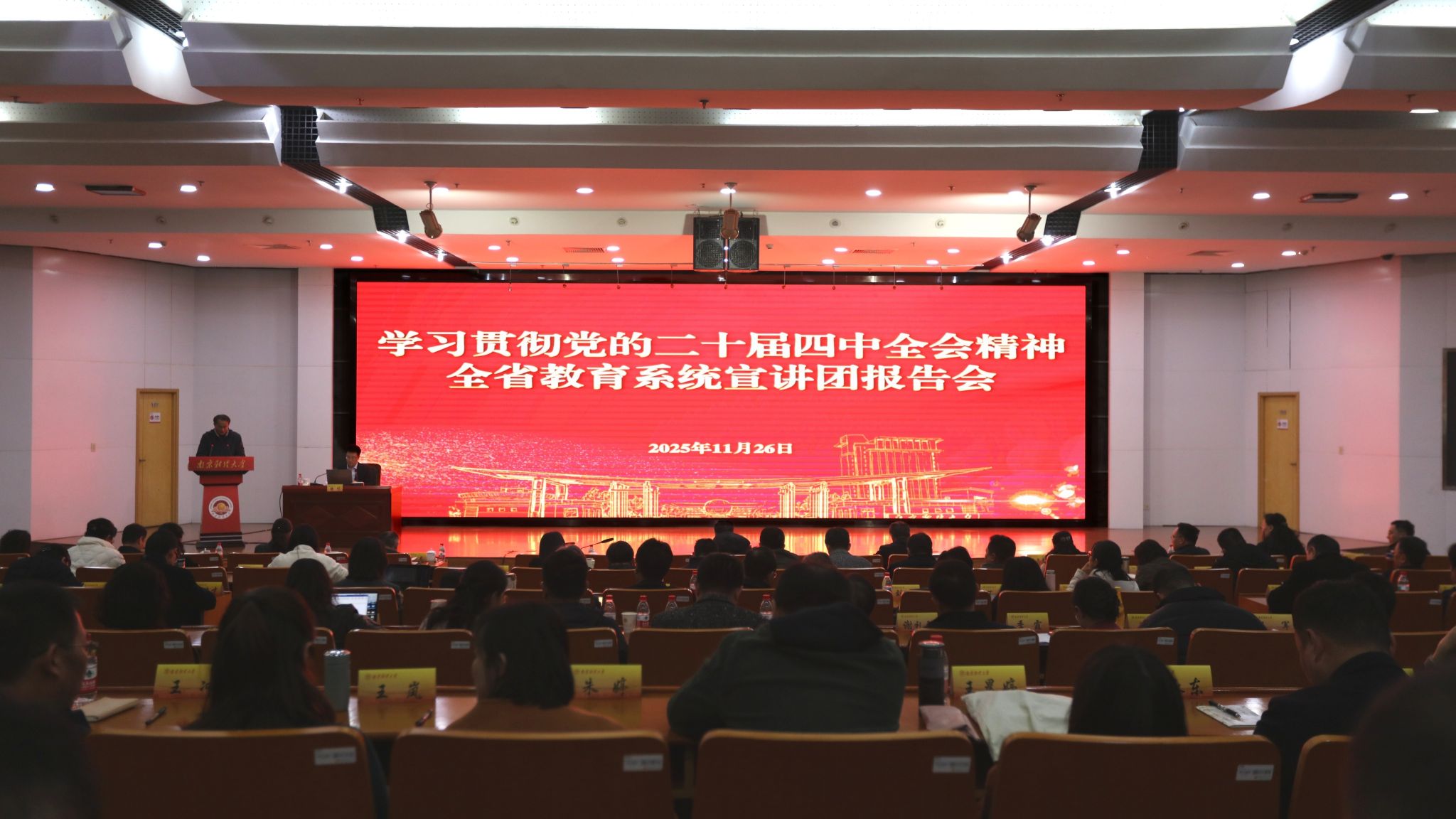 11月26日下午,bat365在仙林校区图书馆一楼报告厅举行学习贯彻党的二十届四中全会精神全省教育系统宣讲团报告会,全省教育系统宣讲团成员,南京航空航天大学党委常委、宣传部部长徐川教授作题为“同上一堂课,启航新征程”的宣讲报告。全体在校校领导,全体党委委员、纪委委员,全体中层干部,资产经营有限公司主要负责人参加报告会。会议由校党委副书记李群主持。