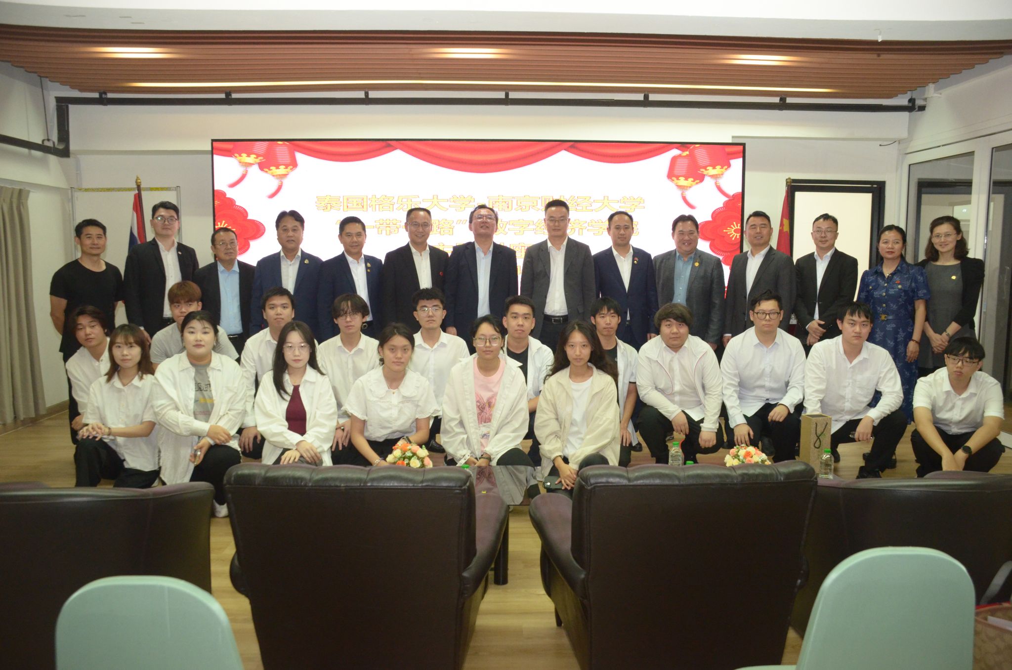 在泰国格乐大学(Krirk University, Thailand)访问期间,代表团与泰国格乐大学理事长王长明、教学副校长素帕、副校长兼中国国际语言文化学院院长罗勇,南洋曼谷商学院院长黄旺明,中国事务校长助理、国际处副处长张腾,教学副校长助理罗成等进行会谈。双方就2+2双学位项目、教师互访、海外校建设、“一带一路”数字经济学院活动等议题达成多项共识,并举行“深化合作 共启未来”“一带一路”数字经济学院启动仪式。叶林祥副校长为在泰江苏企业家及泰国格乐大学师生作了题为“中国经济的长期增长”的讲座。