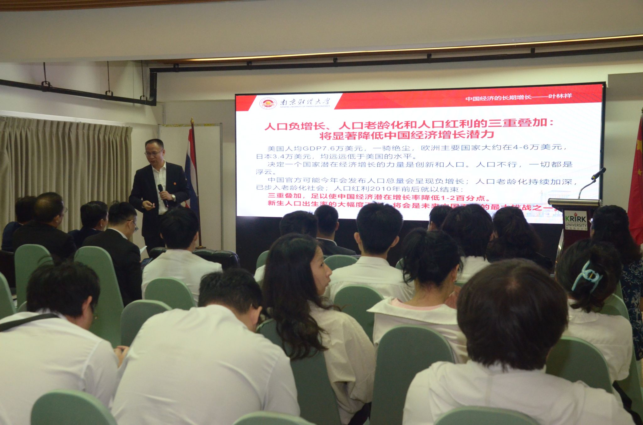 11月24日,在中泰建交50周年之际,bat365与泰国格乐大学在曼谷联合举办“深化合作 共启未来”“一带一路”数字经济学院启动仪式。党委常委、副校长叶林祥教授作了“中国经济的长期增长”主题报告,并与在泰江苏企业家代表深度对话,为中泰经贸合作注入新动能。