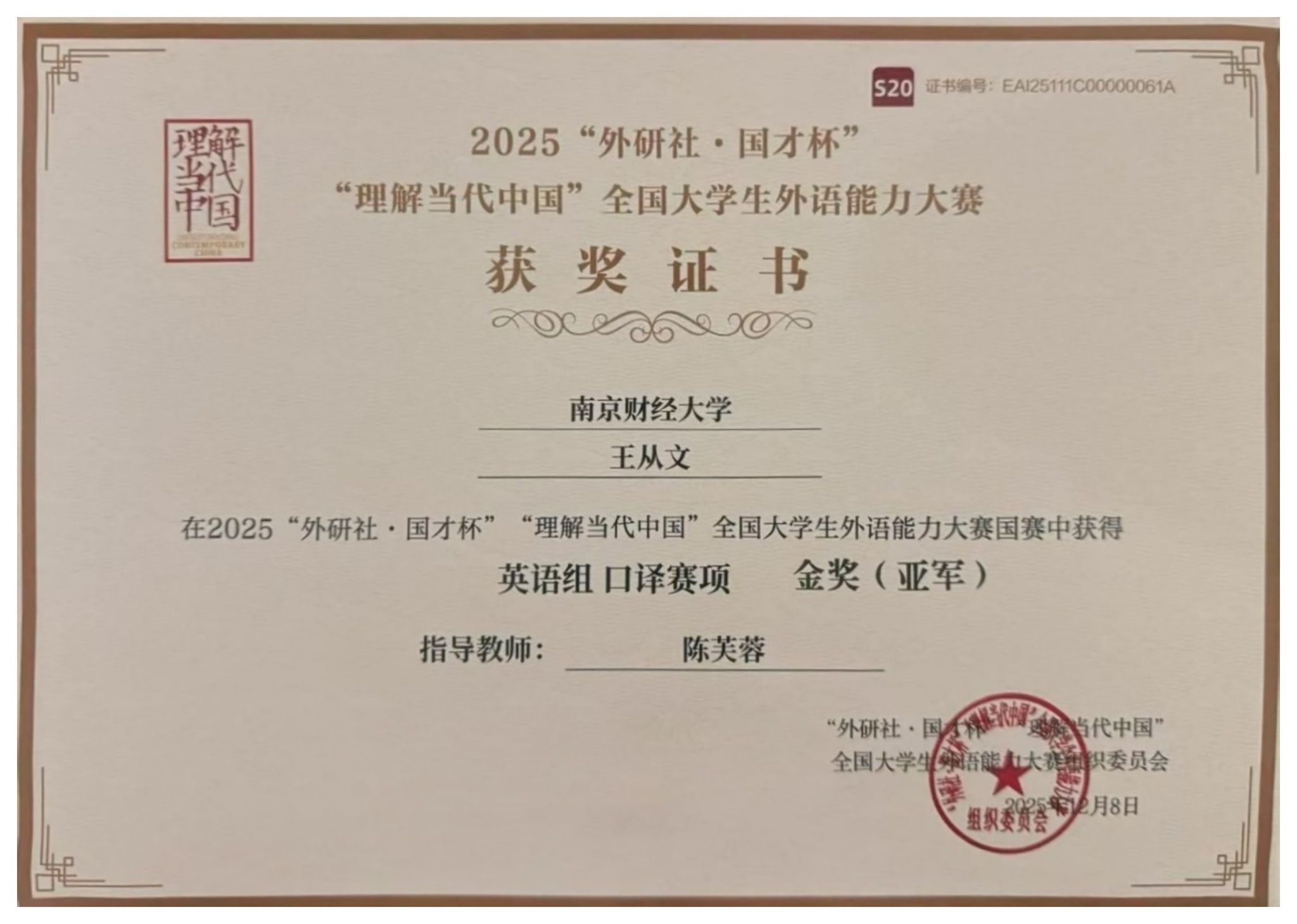 王从文同学在全国大学生外语能力大赛英语组口译赛项中获金奖(亚军)