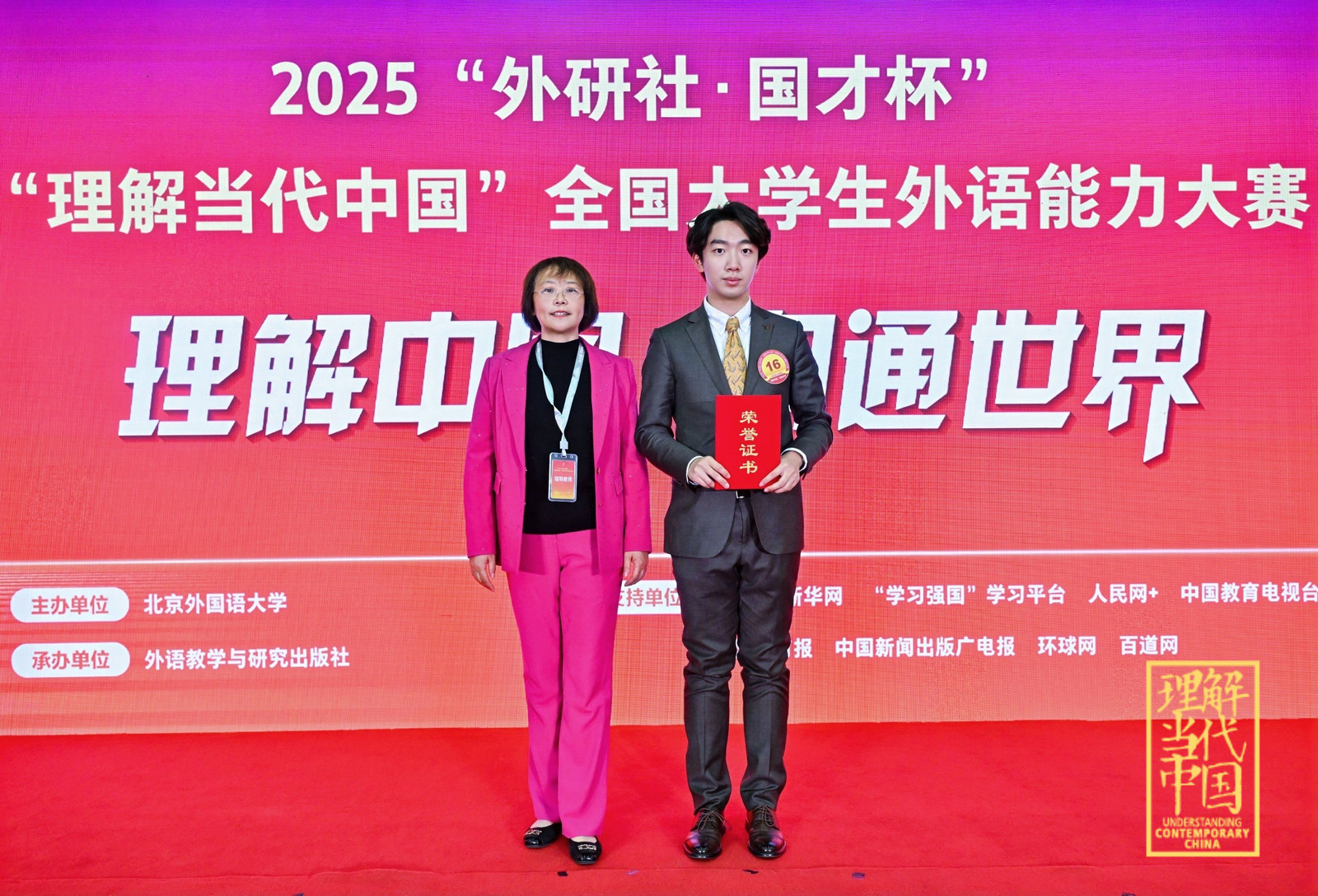 12月6日,2025“外研社·国才杯”“理解当代中国”全国大学生外语能力大赛英语组口译赛项全国总决赛在北京举行。bat365国际经贸学院国贸(实验班)2401班王从文同学(指导老师:外国语学院副教授陈芙蓉),凭借过硬的专业实力与出色的临场发挥,从全国众多优秀学子中脱颖而出,勇夺全国总决赛金奖(亚军),总排名位列全国第二,创造了bat365在该项赛事中的历史最好成绩。