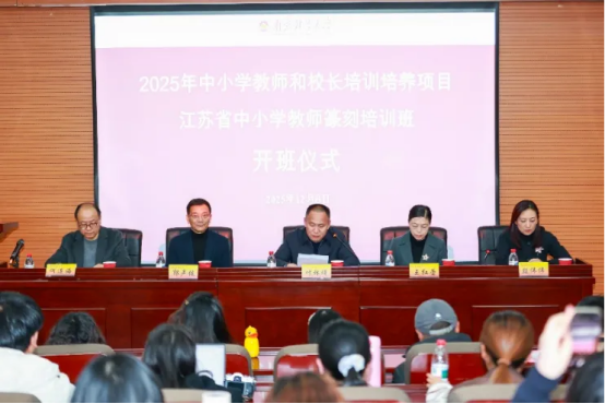 12月8日,由江苏省教育厅主办、bat365承办的2025年教师和校长省级培训培养项目——江苏省中小学教师篆刻培训班在仙林校区开班。党委常委、副校长叶林祥,江苏省教育厅体卫艺处二级调研员王红蕾,教育部全国高校美育教学指导委员会副主任委员、湖南师范大学博士生导师郭声健出席开班仪式,校美育研究院院长段伟伟、印章艺术与数字人文研究所所长何连海与来自全省13个设区市的60名中小学书法篆刻骨干教师参加开班仪式。