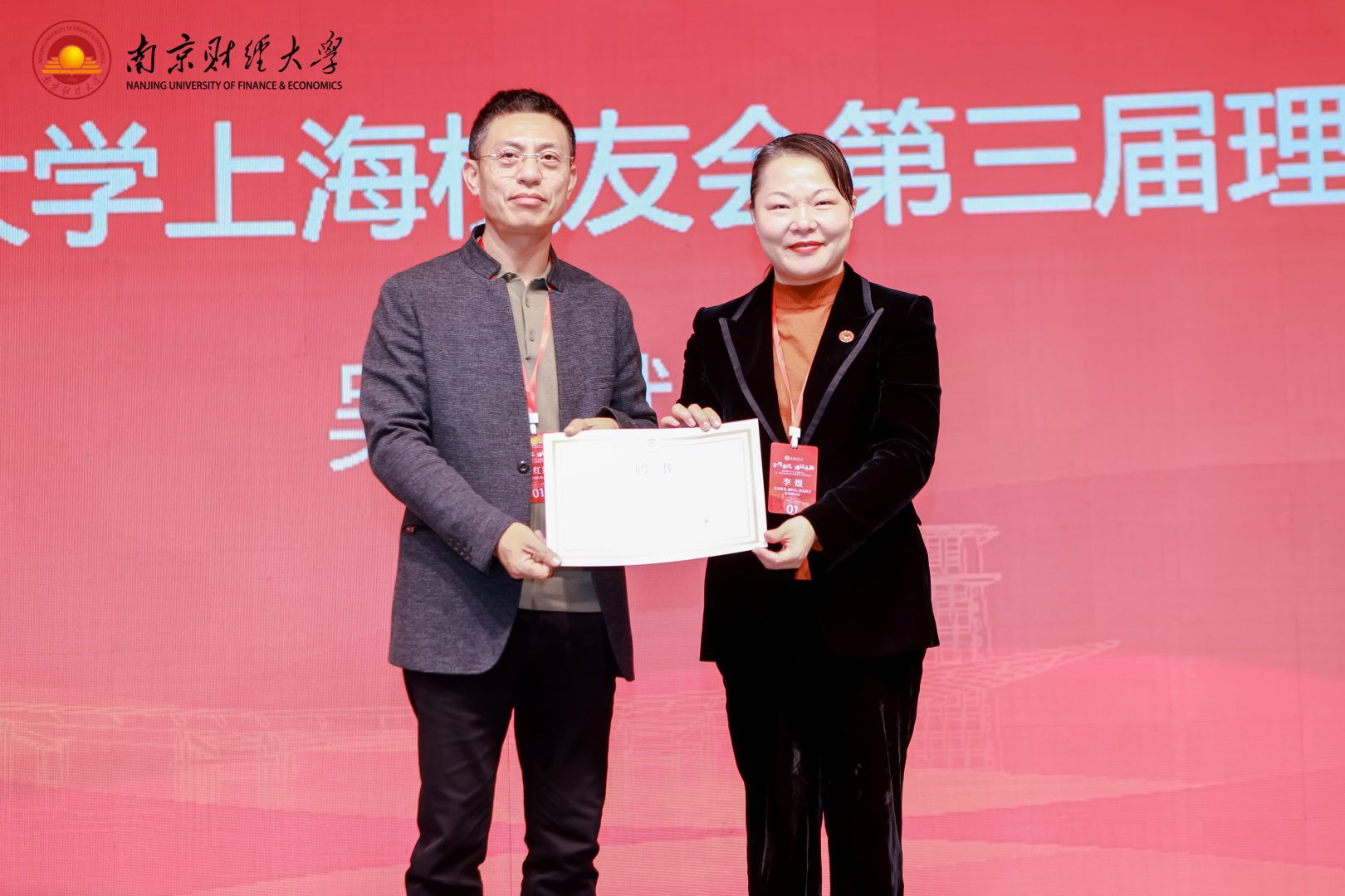 李煜副校长为上海校友会第三届理事会会长吴红斌颁发聘书