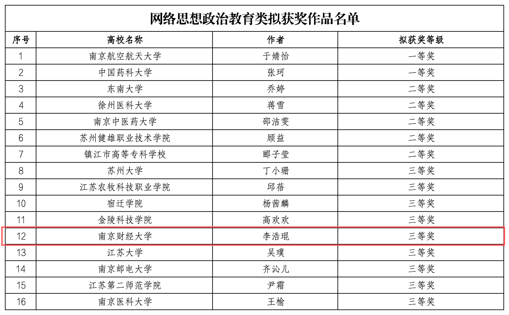 本次全省高校思政“金微课”征集遴选活动由江苏省高校网络思想政治工作中心和高校易班发展中心主办,自2025年10月启动,全省共有503项作品参赛,经材料初筛、资格审核、专家函评、作品政审和终审会评等环节,共遴选出获奖作品108项,其中一等奖16项、二等奖33项、三等奖59项。