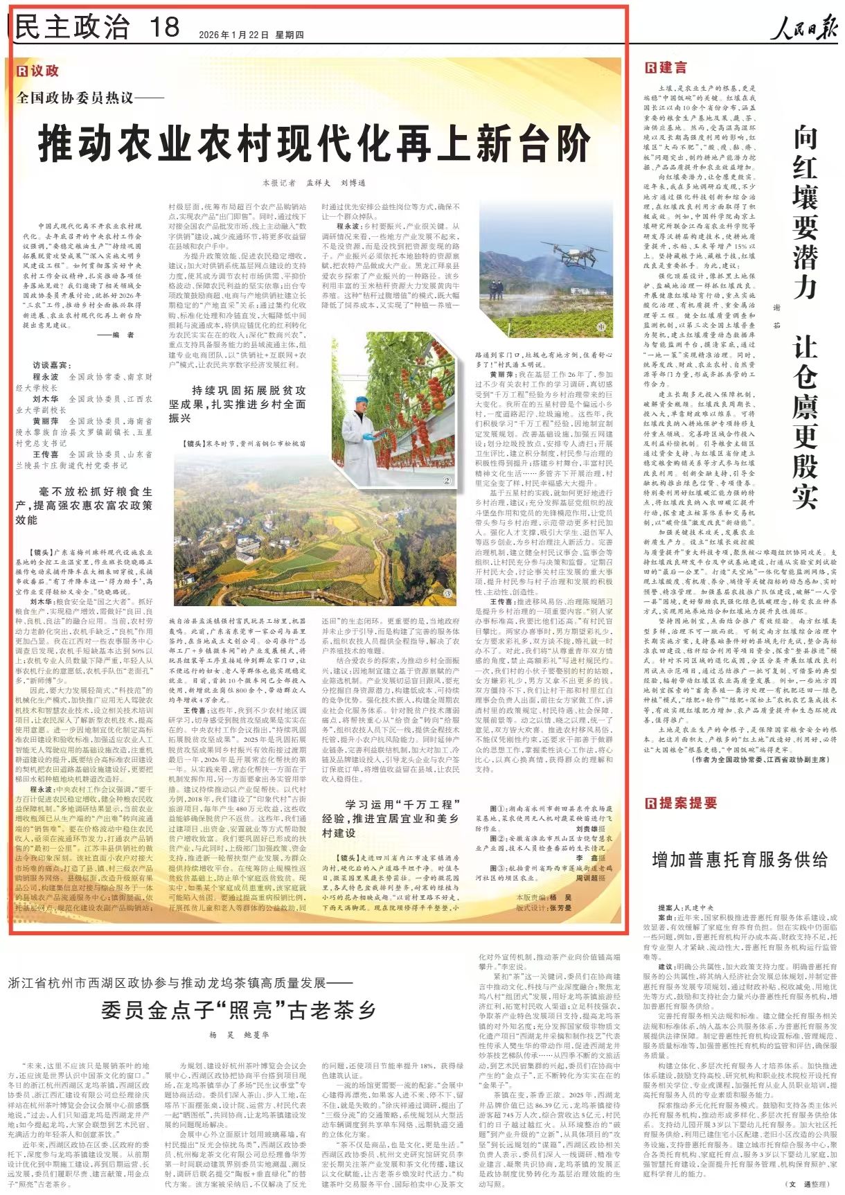 1月22日,《人民日报》刊发《全国政协委员热议——推动农业农村现代化再上新台阶》专访。全国政协常委,校长程永波围绕贯彻落实中央农村工作会议精神,推动乡村全面振兴取得新进展、农业农村现代化再上新台阶进行建言。