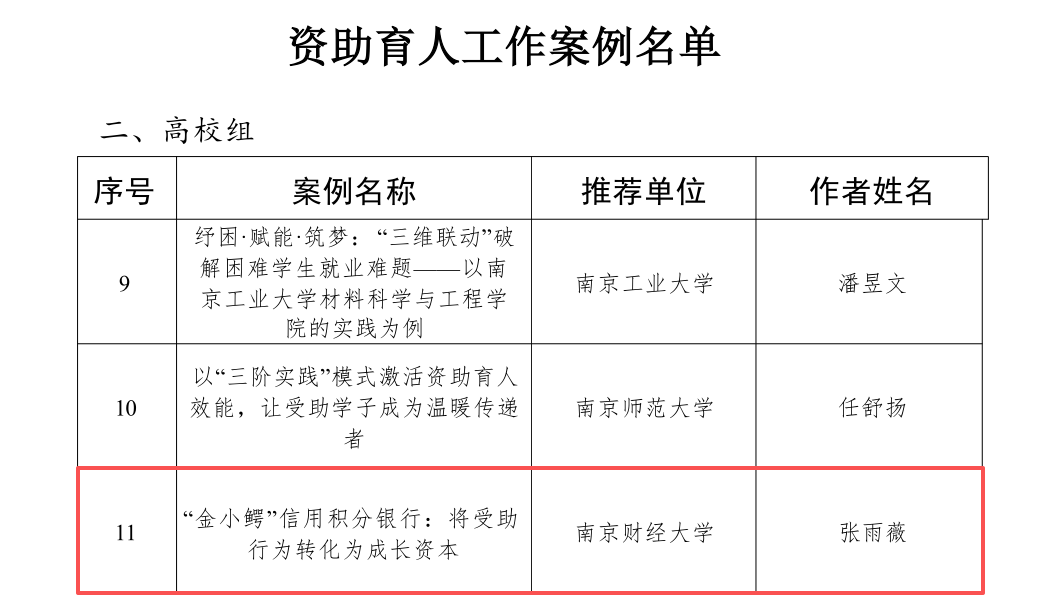 工作案例《“金小鳄”信用积分银行:将受助行为转化为成长资本》,通过将志愿服务、学业进步等6大类20项行为量化为信用积分,推出“成长贷”机制,建立信用评级制度,实施动态风控管理等,形成了“资助一个,带动一批,影响一片”的辐射效应,为高校资助育人工作提供了可参考、可复制的创新方案。