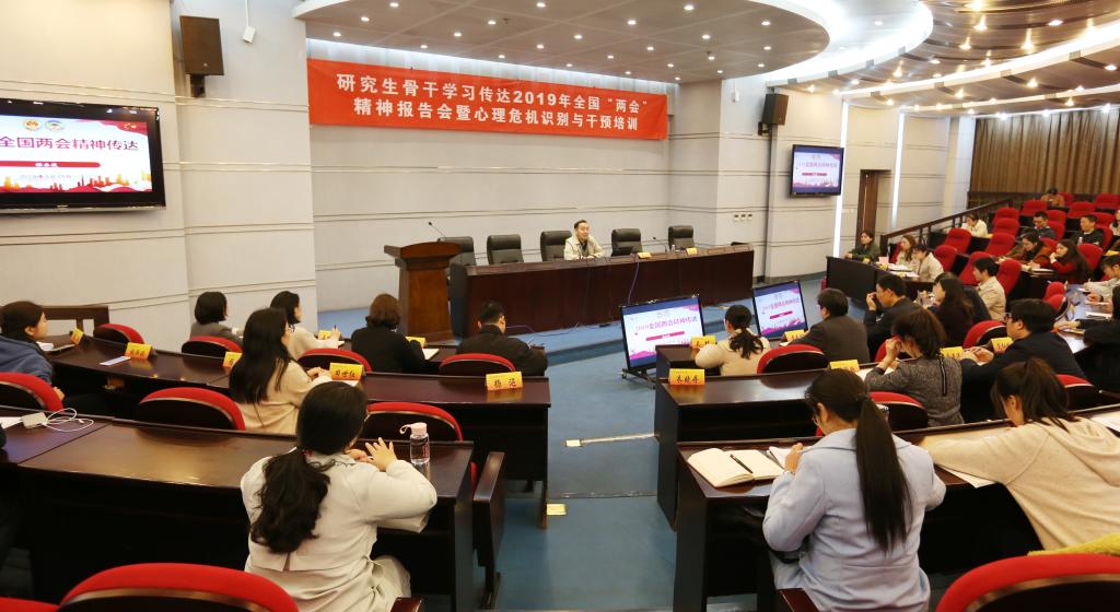 3月25日晚,bat365研究生骨干学习2019年全国两会精神报告会暨心理危机识别与干预培训在仙林校区行政楼二楼报告厅举办。全国政协委员、校长程永波应邀传达2019年全国两会精神。校院两级研究生会干部、全体研究生党支部书记、研究生团支部书记以及研究生秘书、研究生辅导员、党委研究生工作部、研究生院全体人员参加会议。会议由党委研究生工作部部长韩力争主持。