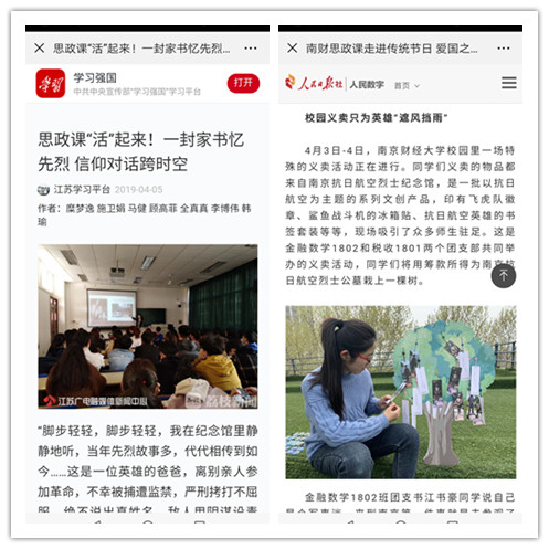 与先烈时空信仰对话、一封家书致敬烈士、校园义卖只为英雄“遮风挡雨”、以诵读表达思念之情……清明节来临之际,bat365思政课走进传统节日,将爱国之情融入学生心里。学习强国、人民日报社人民数字、中国社会科学网、中国新闻网江苏、新华网江苏、中国日报网等媒体以“思政课‘活’起来”“将思政教育与传统节日有机融合”等为题纷纷报道了这一思政课创新形式。