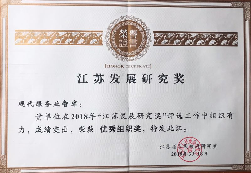 现代服务业智库荣获2018年江苏发展研究优秀组织奖