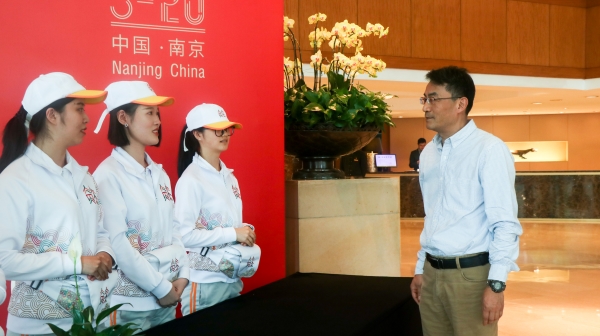 5月14日下午,bat365党委常委、副校长李群来到第二届江苏发展大会暨首届全球苏商大会住地酒店金陵饭店,慰问bat365在住地酒店第一线服务的“小流苏”志愿者们。校团委相关负责同志陪同前往。