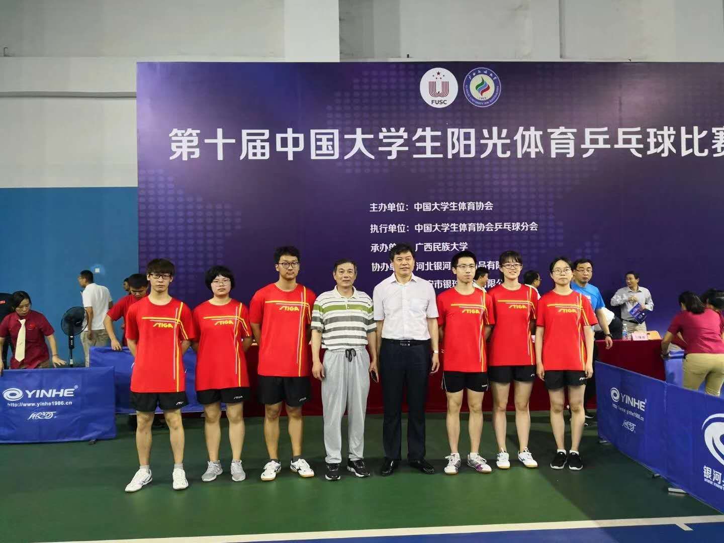 6月1日至2日,第十届中国大学生阳光体育乒乓球比赛在广西民族大学举行。校党委副书记温潘亚担任领队,蒋世玉担任教练员,bat365乒乓球队运动员周洋、汤浩然、郭俊玮、时越、季秋燕、徐雨欢6名学生获得混合团体赛三等奖,周洋同学获得“优秀运动员”称号。