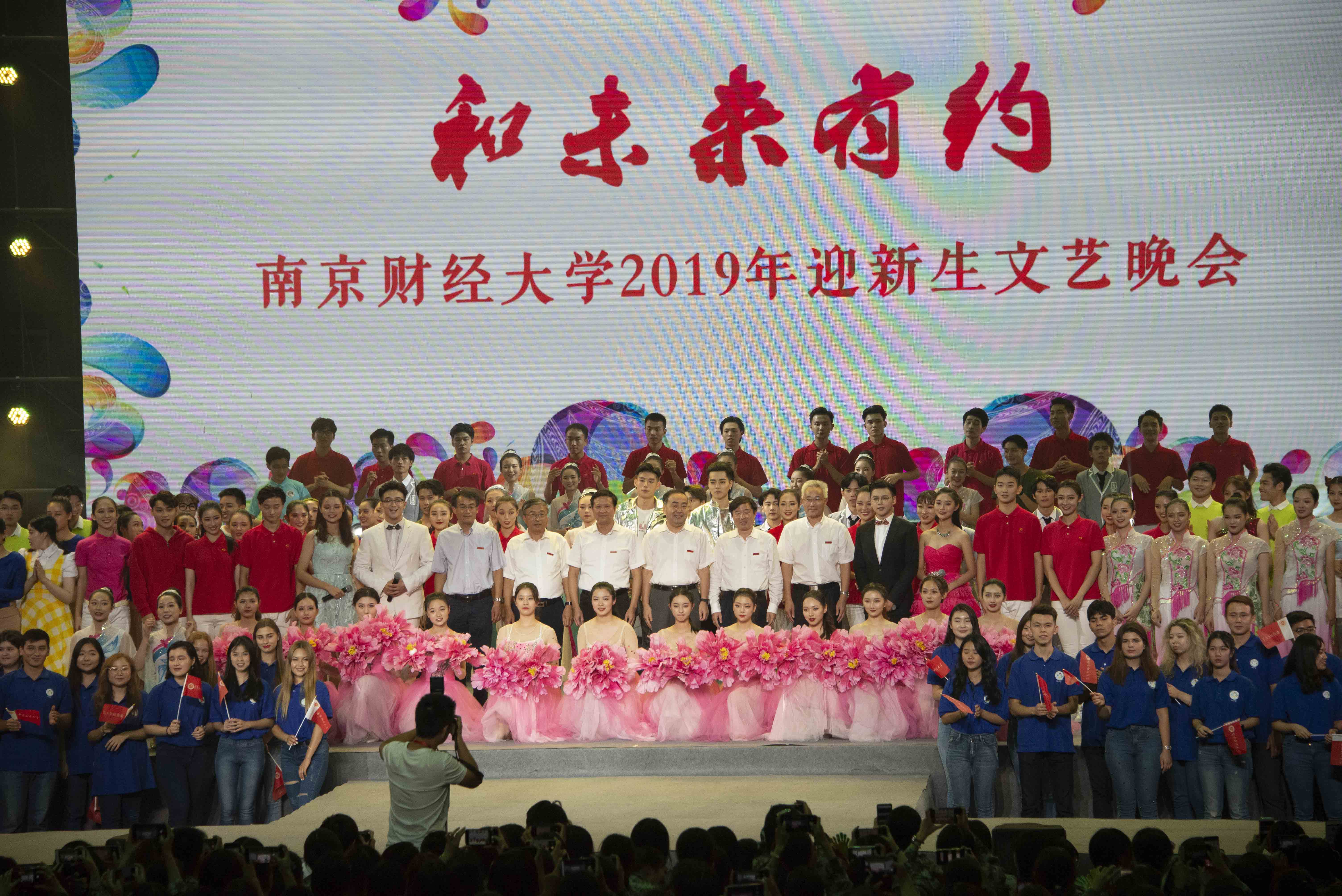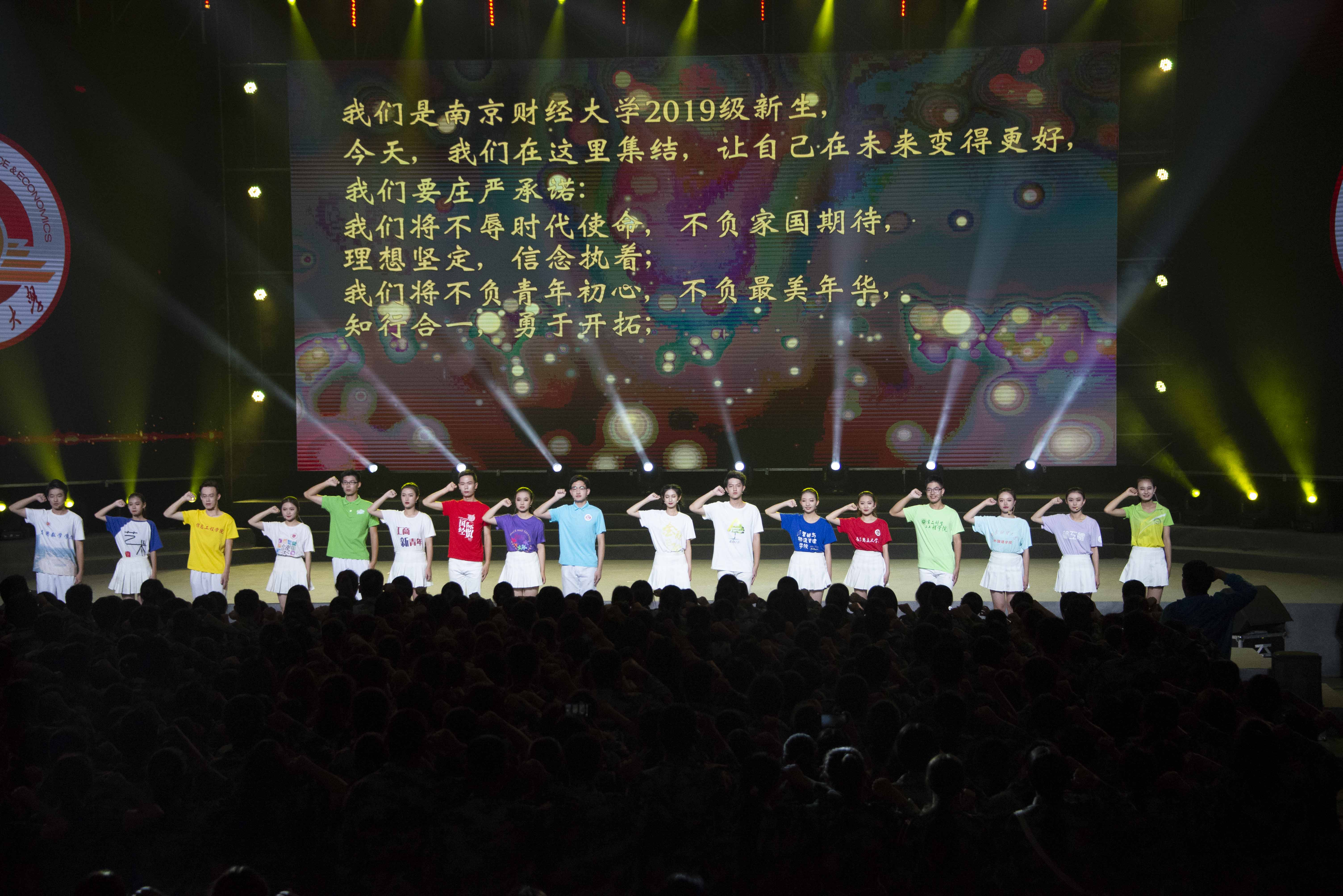 舞蹈《碇步桥水清悠悠》舞姿曼妙,舞步轻盈,将一幅小桥流水人家的画卷徐徐展开;肢体剧《自习室的故事》以夸张的肢体动作,跌宕起伏的故事情节,配以活泼的音乐,让同学们在捧腹大笑中也不禁有所反思;音乐剧《指尖上的生活》通过舞蹈演员们活力四射的歌曲独白和舞蹈动作,告诉我们当代大学生不应被手机所束缚;歌舞串烧《校园之歌》《同桌的你》《夜空中最亮的星》等经典歌曲轻柔舒缓,清新自然;新民乐《江南》琵琶古筝优雅灵动,二胡鼓点雄浑厚重,共同诠释了一个古色古香的梦境;国际教育学院留学生们带来的歌曲《我爱你,南财》歌词字字动人,用悠扬的歌声向南财表白;《青春有你》将南财版的创造101和偶像练习生搬上舞台,尽显青春活力,将晚会气氛推向高潮;《困·战》用肃穆的音乐、强健有力的舞蹈动作致敬教官;校友张远惊喜现身,带来歌曲《伤城》《勇者无畏》,游刃有余的台风点燃全场,赢得学弟学妹们阵阵尖叫;音诗画《追梦·最青春》别出心裁,彰显青春风采;举起右臂,紧握拳头,新生宣誓环节,以青春之名,庄严承诺不负青年初心,不负最美年华,不辱时代使命,不负家国期待,为中华民族的伟大复兴而奋斗。
