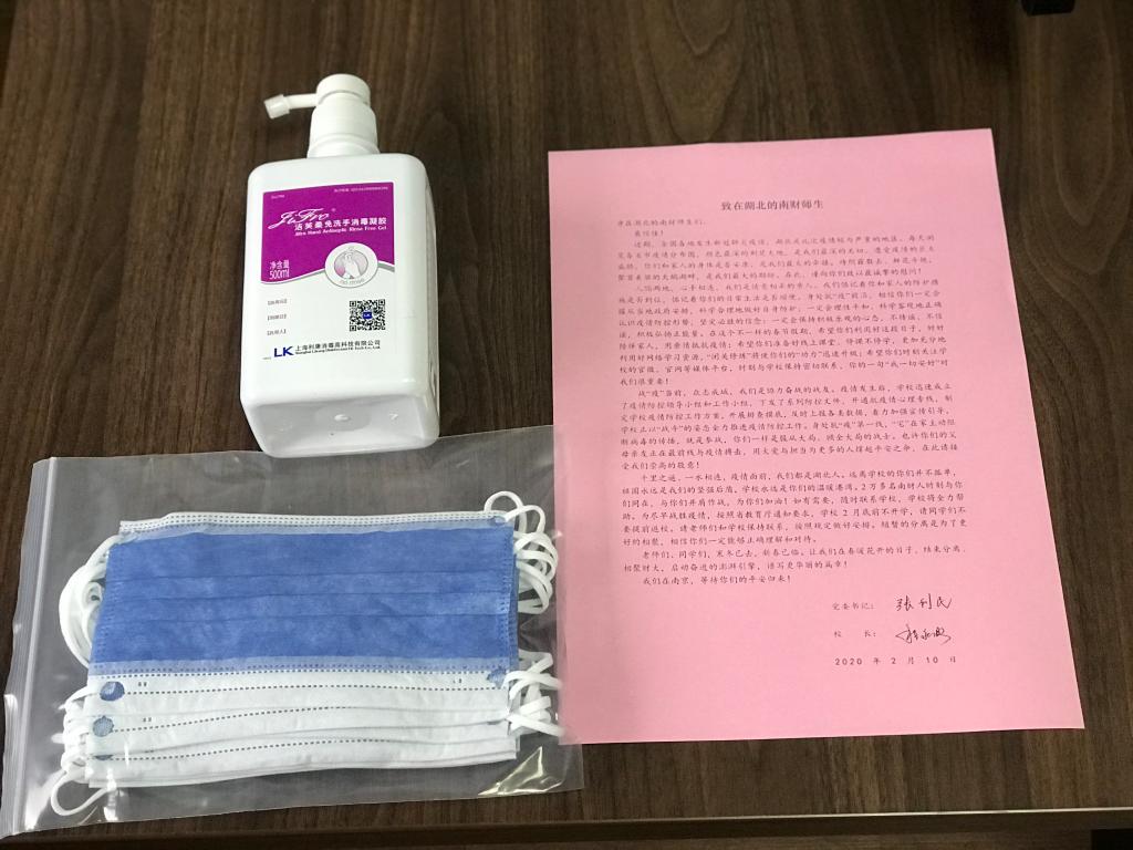 “人隔两地,心手相连,我们是情意相牵的亲人;战“疫”当前,众志成城,我们是协力奋战的战友;千里之遥、一水相连,疫情面前,我们都是湖北人。”2月11日,正值湖北疫情防控的关键时期,一封bat365官方网站党委书记张利民、校长程永波署名的慰问信,连同560副口罩、56甁免洗手液等物资紧急寄往在湖北的56名南财师生。
