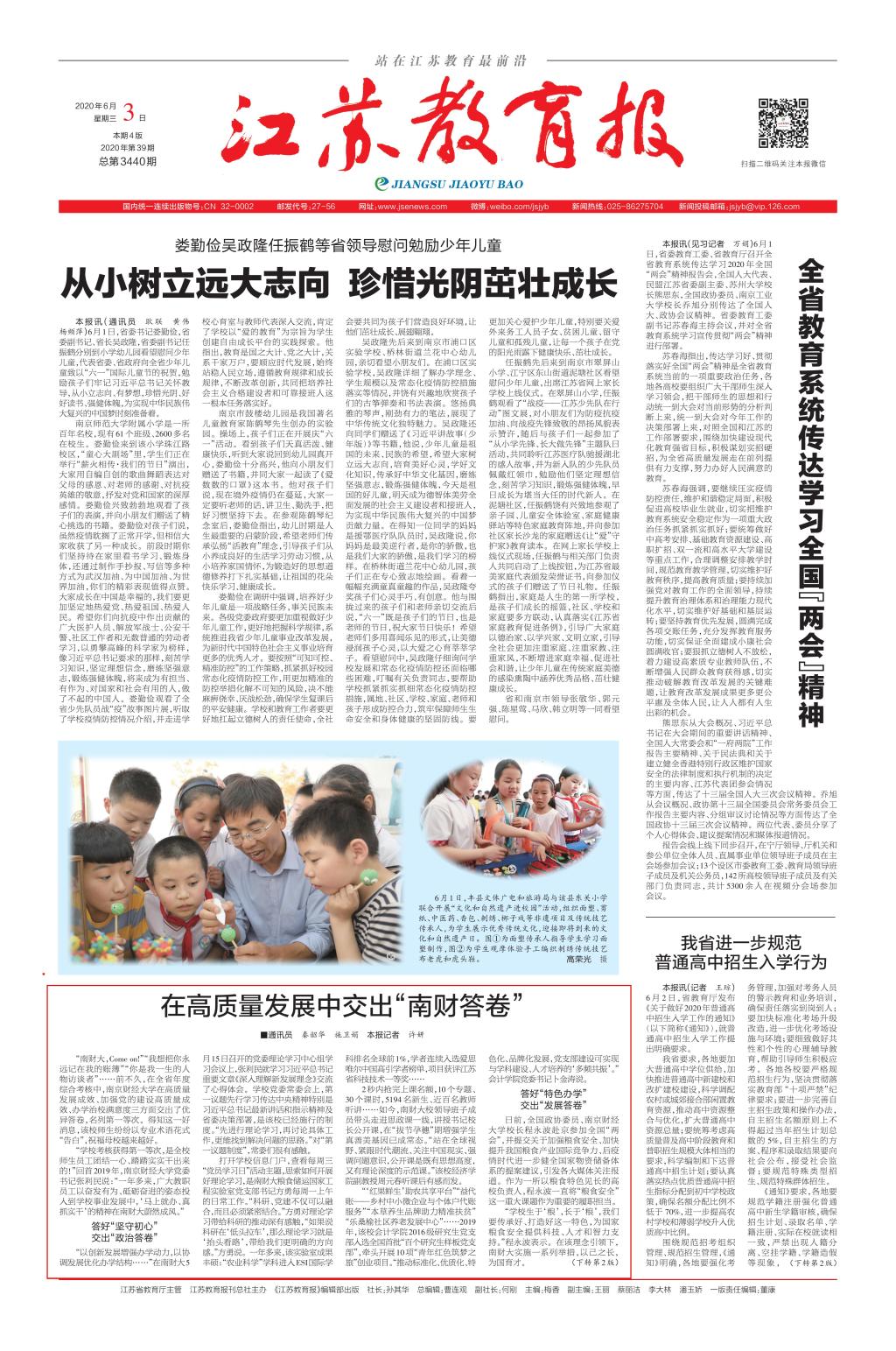 6月3日,《江苏教育报》头版以“在高质量发展中交出‘南财答卷’”为题报道了bat365高质量发展成效。