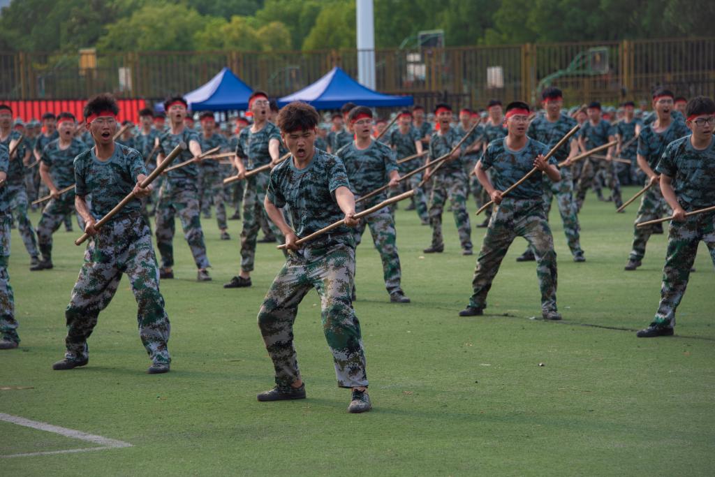 军训成果汇报大会上,在慷慨激昂的阅兵进行曲中,分列式方阵入场。他们昂首挺胸,朝气蓬勃,整齐紧凑的队形彰显了严明的纪律。军训科目表演中,1600余名新生不断变换队形,摆出箭头、十字路口、帆船、问号和五角星等图案,表达了对未来的憧憬、向前进的决心;临敌如游鱼戏水,出手似弹灰抛锤,男生的棍术豪迈有力,凸显男儿本色;女生的刺杀术气势如虹,展现巾帼英姿;女子军歌方阵入场,带来慷慨嘹亮的军歌表演;四起的硝烟中,分队战术方阵的出现将现场的气氛推向高潮,队员们沉着冷静,意志坚定,还原战场的紧张和危险,体现中国军人的英勇与热血。