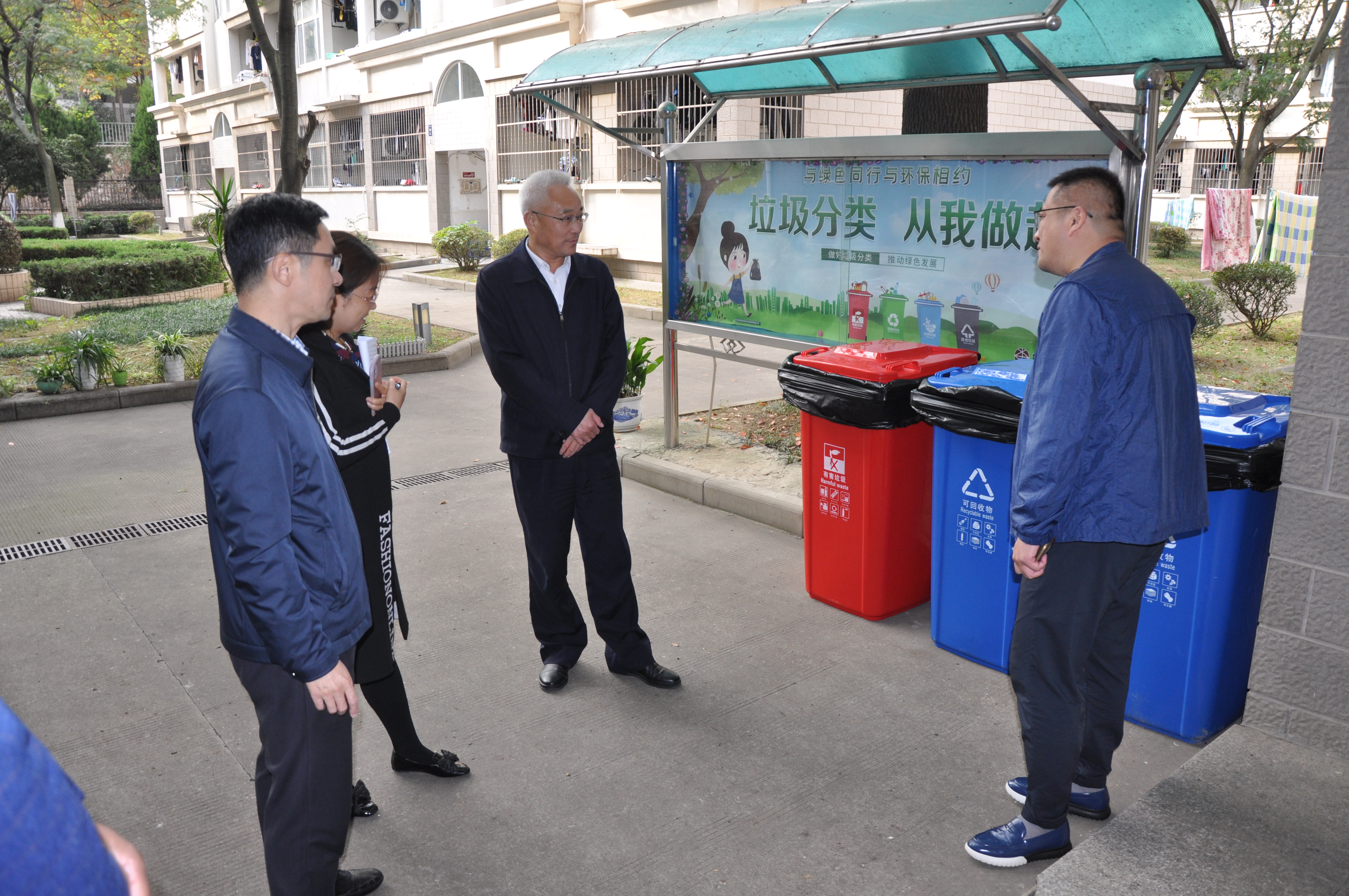 张为付副校长一行先后实地察看了仙林校区中苑垃圾站、学生宿舍等场所,对学校生活垃圾分类的宣传、桶点设置、分类管理具体运行情况进行了解和检查。