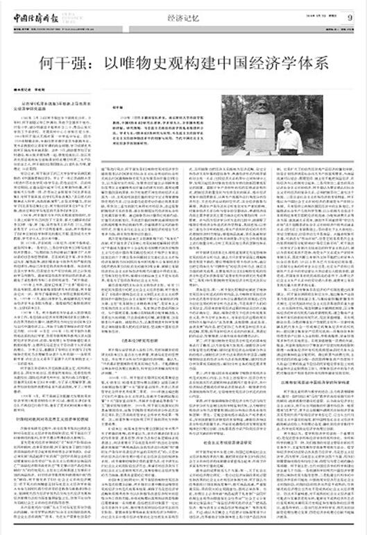 何干强研究《资本论》,特别重视研究马克思唯物史观的经济分析方法。他认为只在哲学层面上理解唯物史观是不够的,要应用唯物史观于经济分析,就应当把它具体化为“可操作性”的经济分析方法。他在这方面的研究成果,主要体现在论文《论唯物史观的经济分析范式》(获教育部“高等学校科学研究优秀成果奖”二等奖)和专著《唯物史观的经济分析范式及其应用》中。