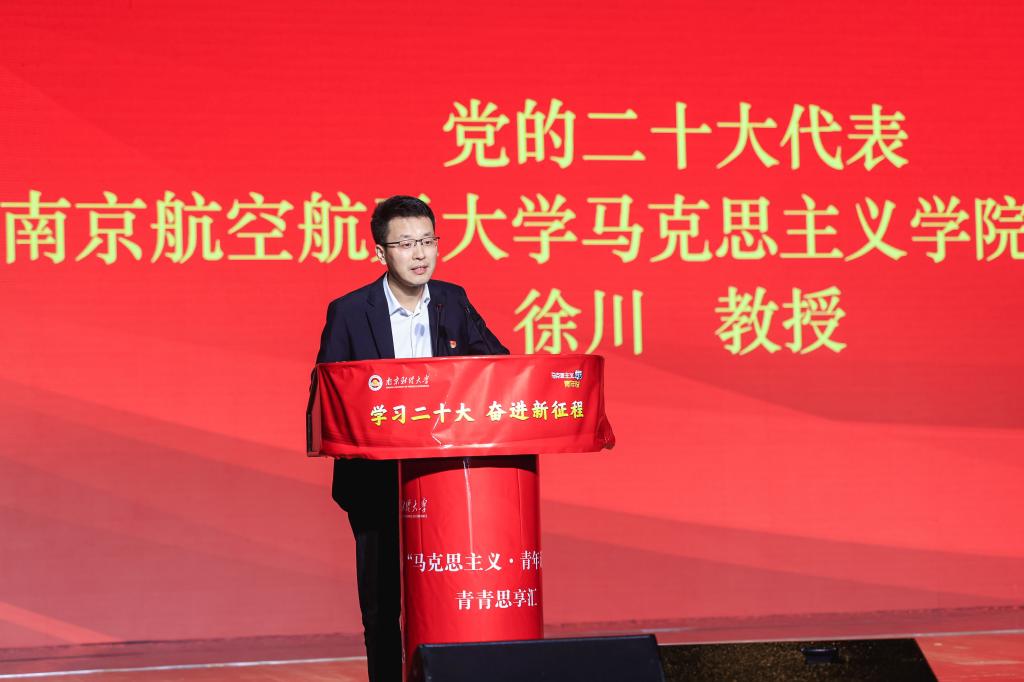 活动现场,党的二十大代表、南京航空航天大学马克思主义学院党委书记徐川教授从“有传承、有主题、有主线、有重点、有回顾、有总结、有深情、有号召”等方面分享了参加党的二十大的感受和学习党的二十大精神的体会。