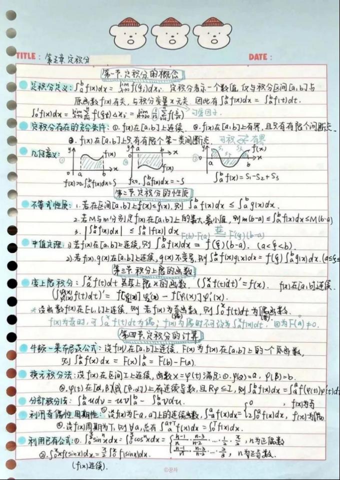笔记有道,不同专业有不同的笔记方法,用对了方法,学习事半功倍。“记笔记要结合课本、简略得当、追求美感。以高数为例,能画图或者用数学符号表示的尽量多用,这样会更直观清晰。颜色不要太多,多的话会显得杂乱。建议用三四种颜色。比如红笔记章节名称,黑笔记基础的性质概念,蓝笔抄例题,绿笔复习时补充。”质管2101李翊菲的笔记法让微积分学习不再一筹莫展。