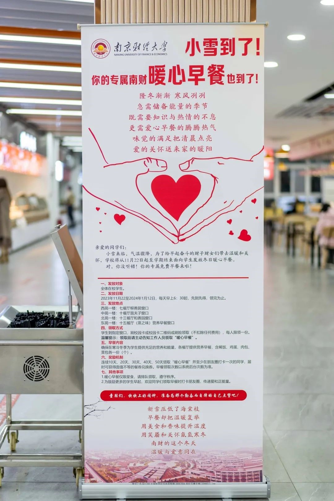 为了给早起奋斗的财子财女们带去温暖和关怀,学校从11月22日起至学期结束面向全体在校学生发放冬日暖心早餐,在西苑、中苑、东苑、北苑指定窗口均可领取,方便住在不同区域的学子。学生只需到指定窗口,刷校园卡或校园卡二维码或刷脸,凭借暗号“领取‘暖心早餐’”,即可免费领取一份能量满满的早餐。