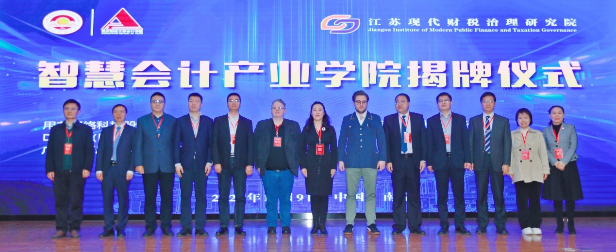 随后,来自用友网络科技公司、DAMA中国、天衡会计师事务所、福思特科技有限公司、爱尔兰都柏林圣三一大学、意大利路易斯商学院等单位的专家们跨界协同,为bat365官方网站智慧会计产业学院举行了揭牌仪式。