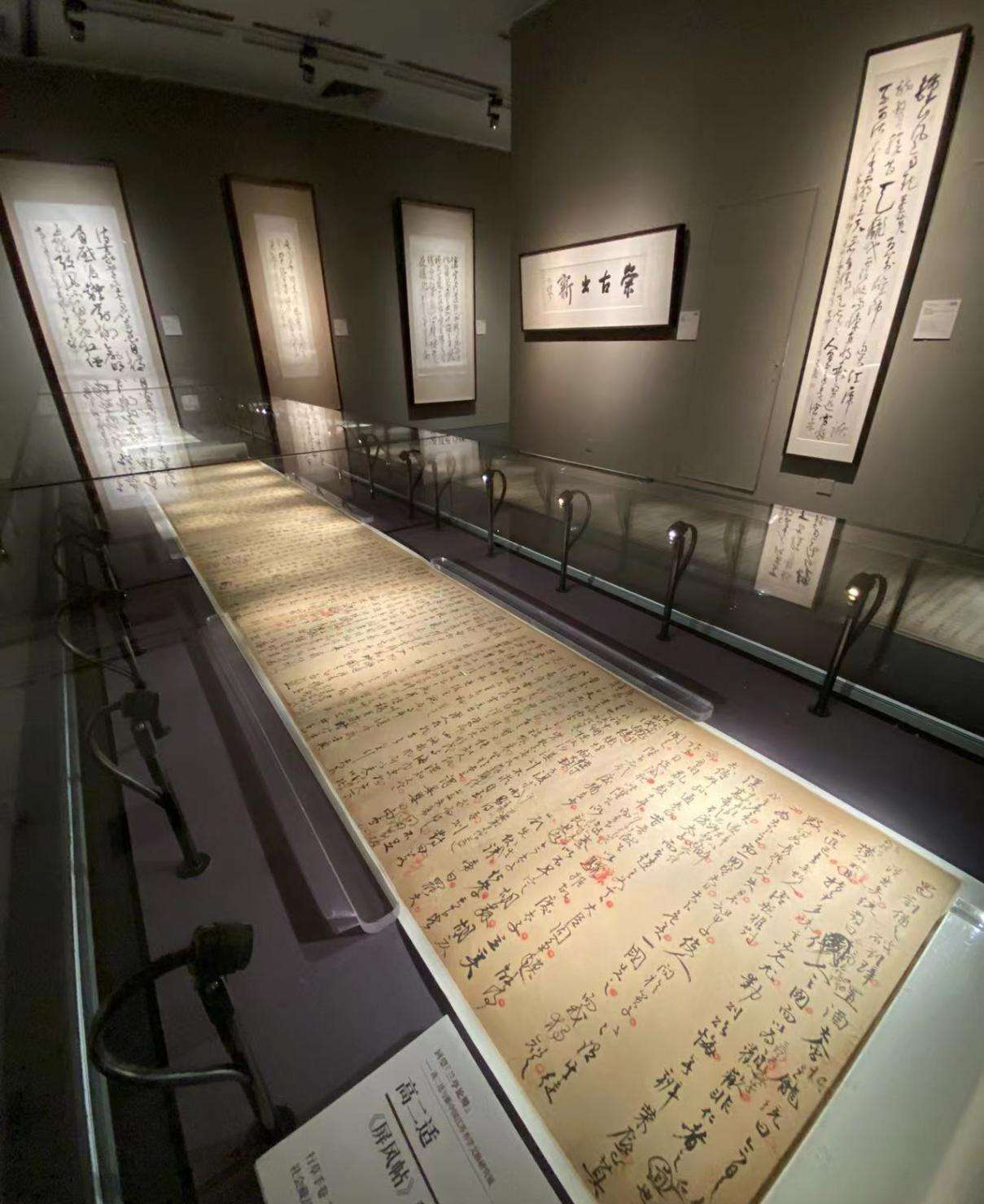 展厅中,中国美术馆馆长吴为山所书行草横幅《忆高二适先生》道出一段往事。吴为山认为,研究学习高二适需要了解他的治学方法和艺术风格,同时也需要从他的书论和批注中理解他对书史、书体、书风的研究,为构建书法美学的体系提供新的审美意象。