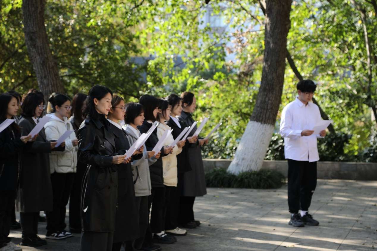 师生前往侵华日军南京大屠杀遇难同胞丛葬地,开展“勿忘国耻,圆梦中华”主题党日活动。新闻学院党委书记、本科生党支部政治辅导员陈丹进行了现场党课教学。