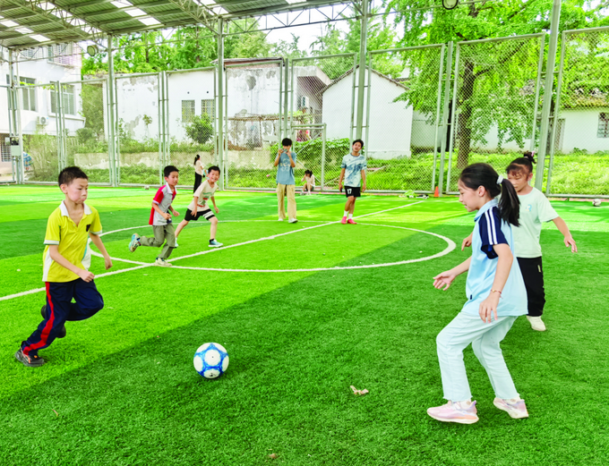 记者了解到,“传球支教”项目自启动以来,已连续八年赴广西桂林灵川县海洋乡开展暑期支教,已有千余学生参与进来,形成“足球启梦”“同心传球”“强体育心”三大主题的体教融合模式。“软件”有了,“硬件”更要跟上。在多方努力下,支教团为建成海洋乡足球公园助力,孩子们拥有了属于自己的绿茵场地。去年,团队特邀中国女足国家队前队员管菁菁线上指导,联合校足球队成员徐子航、朱锐担任主教练,在海洋乡中心校开展为期两周的支教活动。